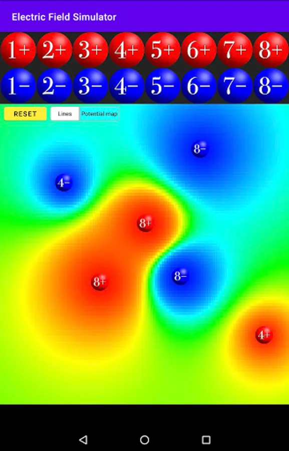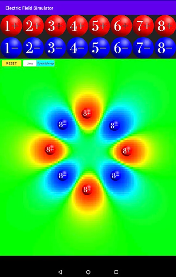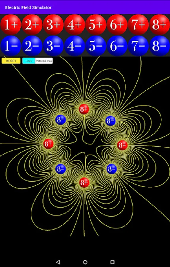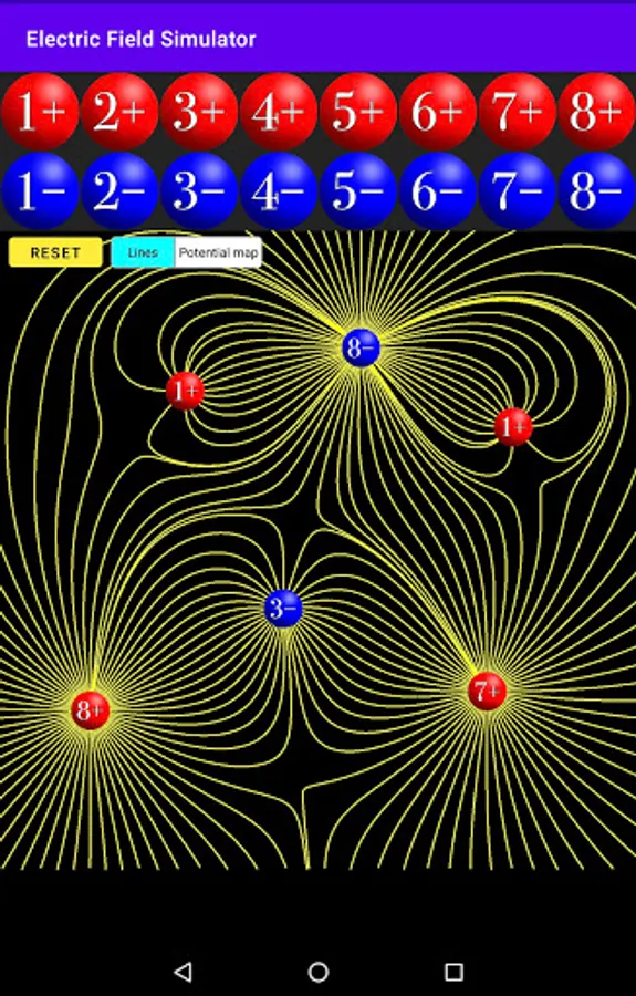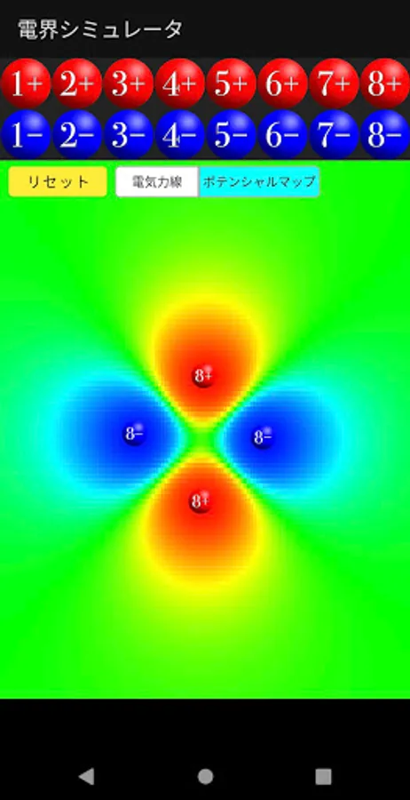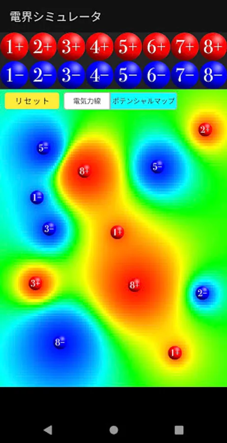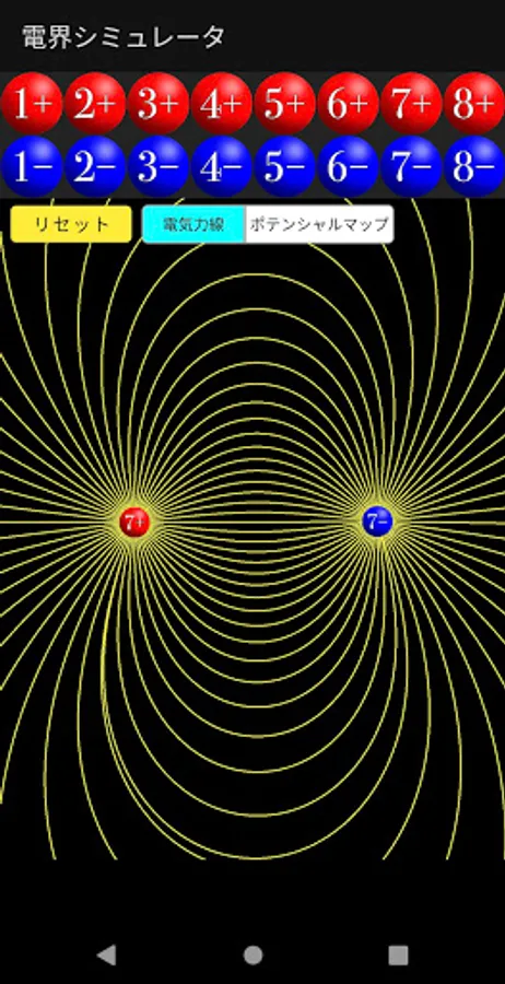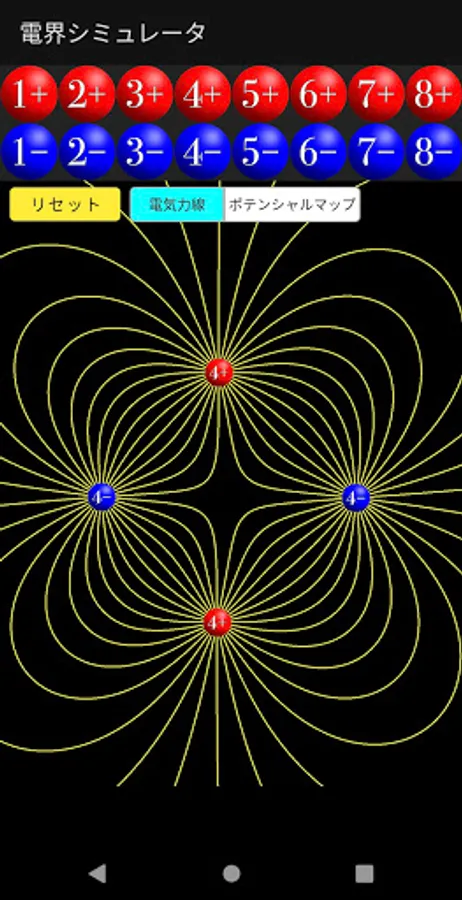 It's an app that help you to observe states of field made by point charges. Let's drag charges to canvas. Then, line of electric force or electrostatic potential map is drawn.