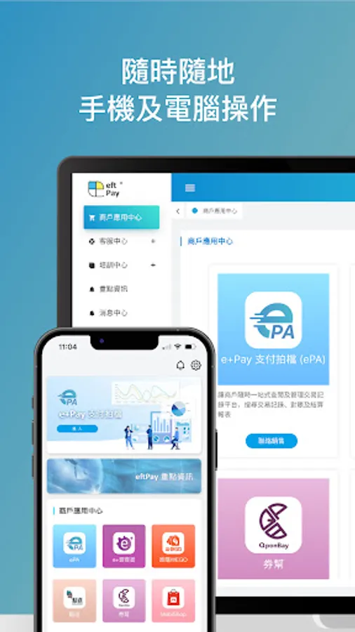 eftPay Merchant Center provides a one-stop application platform for merchants to help them manage their business more efficiently and intelligently. In addition to viewing the transaction records and reports of electronic payments, you can also manage inquiries, view teaching videos, and the latest news. Merchants can also register and use the services of eftPay and partner institutions through the application center, such as promotion platform, online sales, retail management system and other functions.