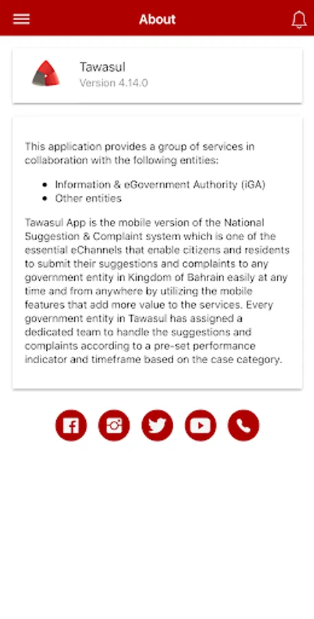 Tawasul App is the mobile version of the National Suggestion & Complaint system which is one of the essential eChannels that enable citizens and residents to submit their suggestions and complaints to any government entity in Kingdom of Bahrain easily at any time and from anywhere by utilizing the mobile features that add more value to the services. Every government entity in Tawasul has assigned a dedicated team to handle the suggestions and complaints according to a pre-set performance indicator and timeframe based on the case category.