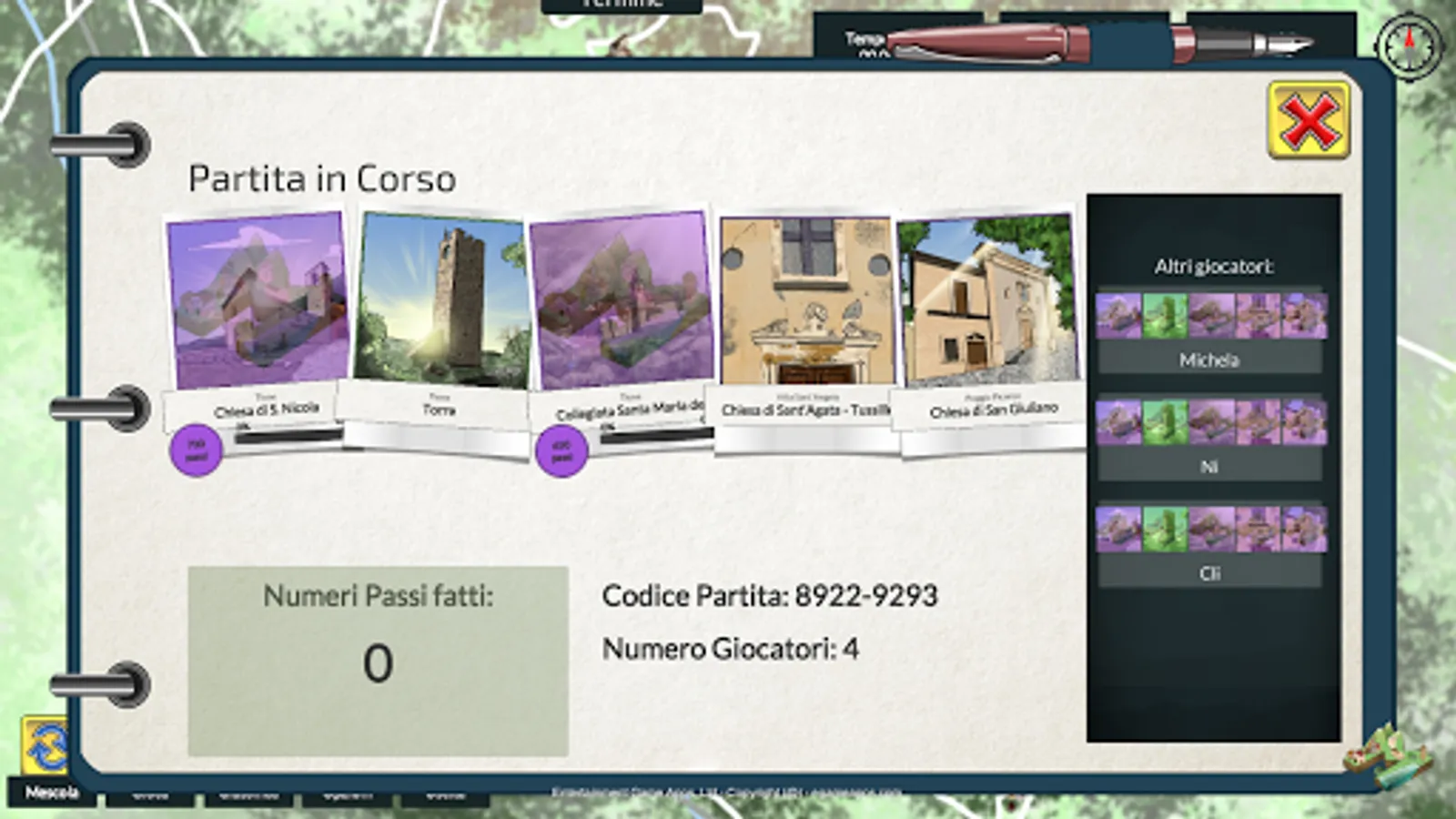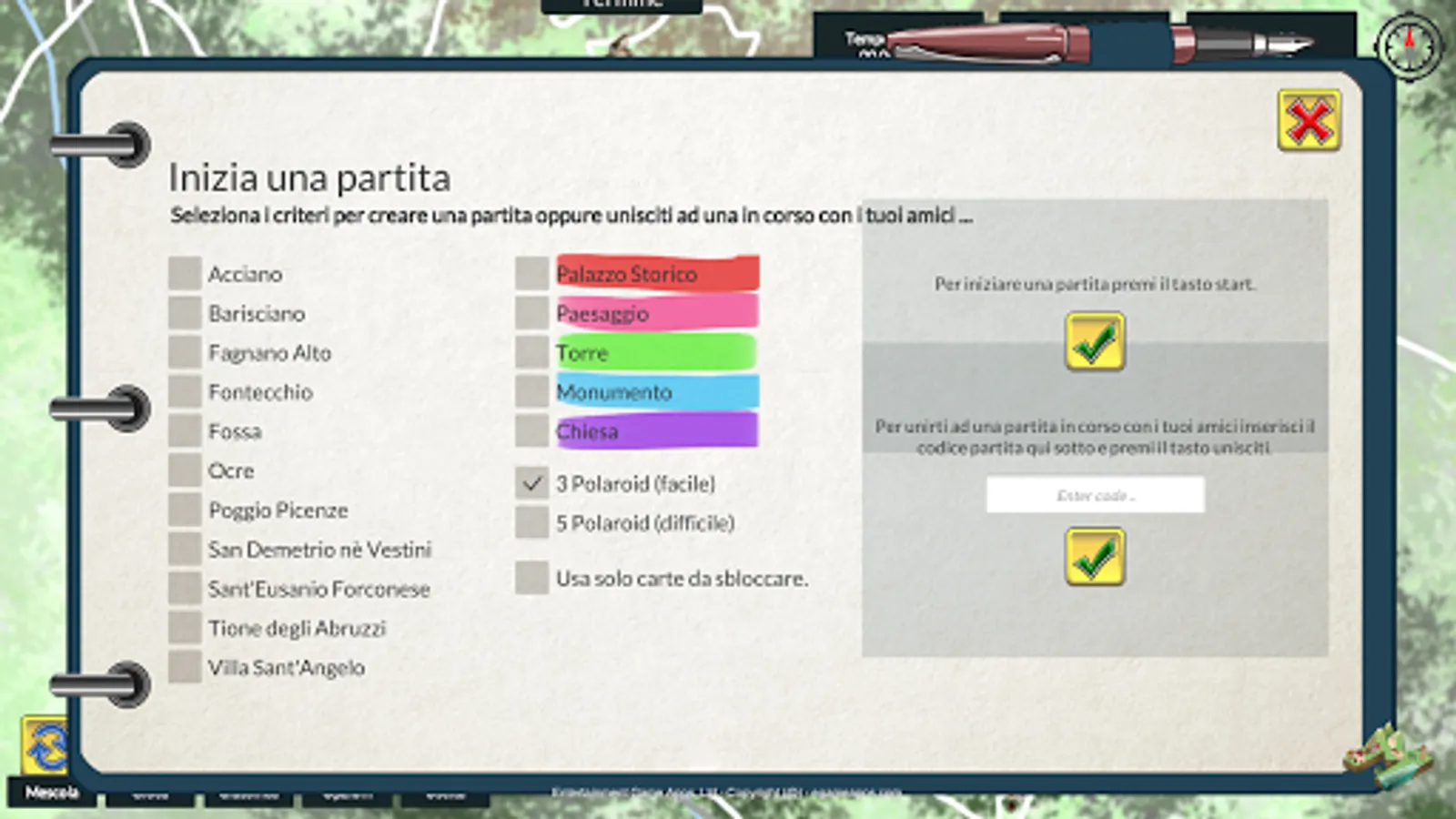 The player will have the opportunity to explore the territory of L'Aquila through suggestive stages represented by "photographic" cards. Each card represents a place of interest, categories, which can be unlocked thanks to the use of the smartphone pedometer: the player will have to accumulate steps to progress in the game.