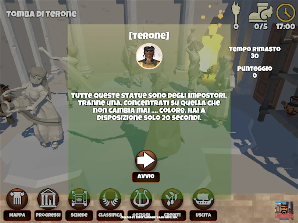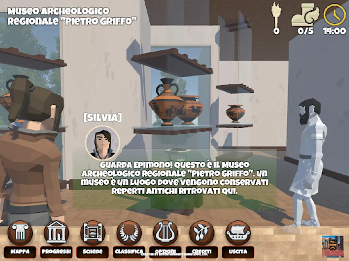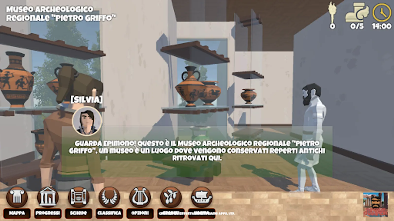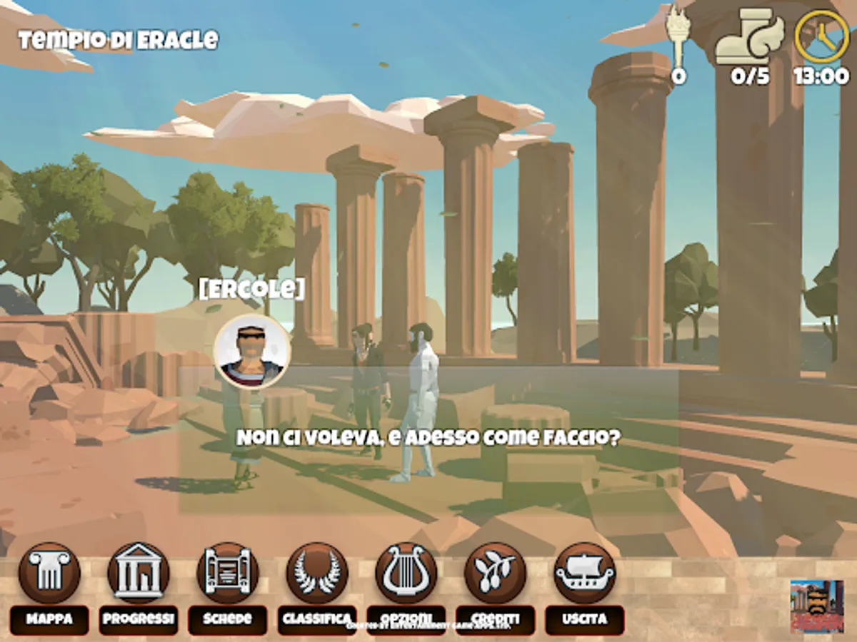 At the end of the tests a portal opens, a temporal rift that leads Silvia and Epimono towards the ancient Eraclea Minoa, when it was still intact and prosperous. To reach the agora where the city is ready to celebrate him, Epimono has to face one last orientation test (he hasn't been back to Eraclea for a few centuries, after all!). Through the labyrinth minigame, Epimono and Silvia reach the agora but when everything seems ready for the city celebrations, Esseneto appears. “If you really want to be Sicily's greatest champion, you'll have to face me first!”.