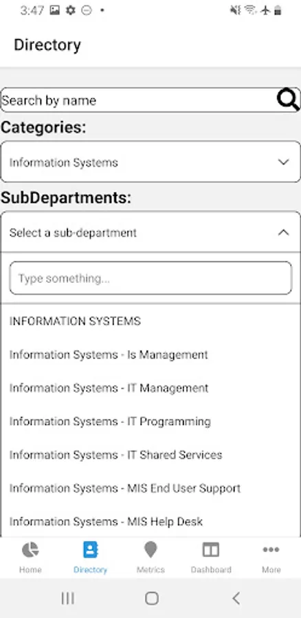 The in-app directory assists the user to contact other employees through a search filtered by name, department, or sub-department.