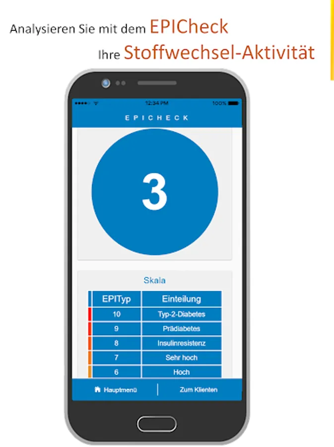 The EPICheck analyzes the derailment of the metabolism and the degree of insulin resistance at an early stage on the basis of blood and body data. The resulting tailor-made epigenotype (EPITyp) is the measure of the metabolic imbalance.