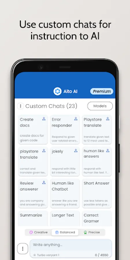 With Aito AI, you can create custom chats tailored to your specific needs, making it your very own AI assistant.