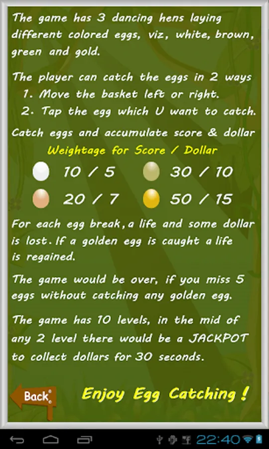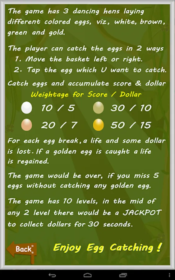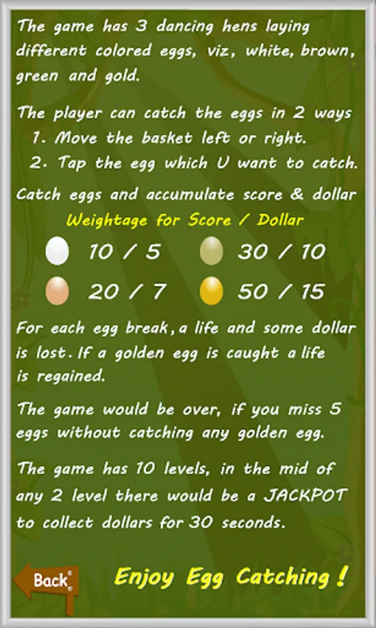 - The player not only catch the egg, but also earn dollar for every egg catching.