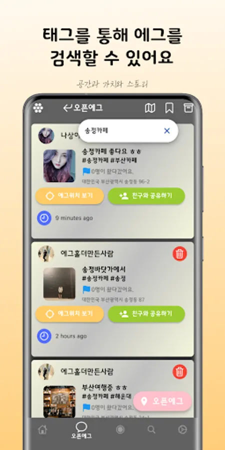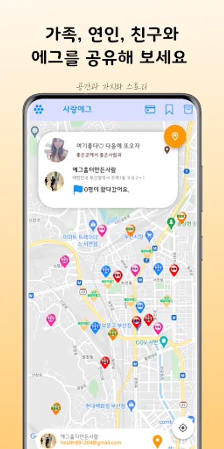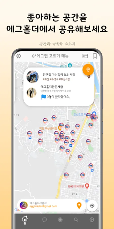 Open Egg can share each other's favorite space with all egg holder users. Shared eggs are marked with a marker on the map, and flags or comments can only be made within a 300m radius of the egg location.