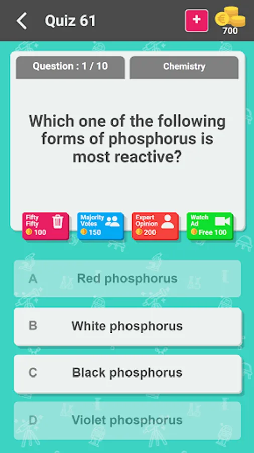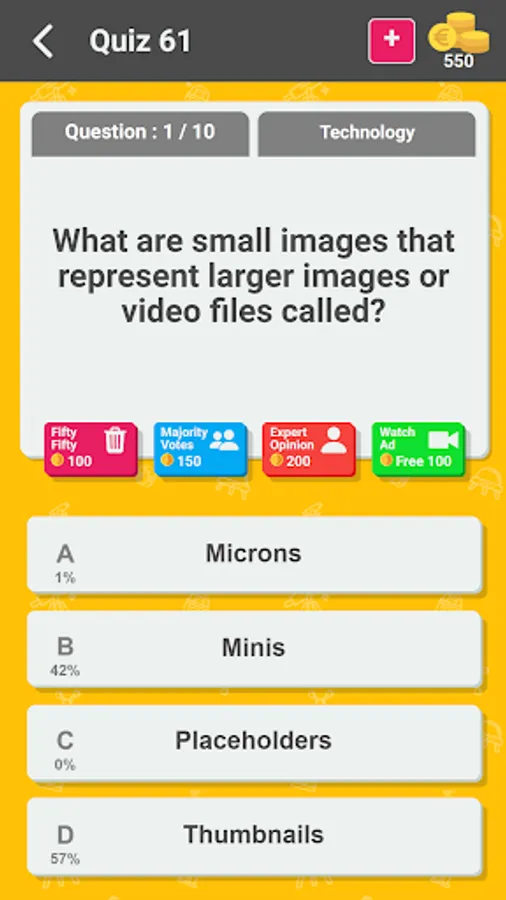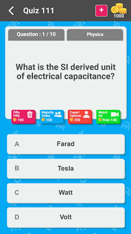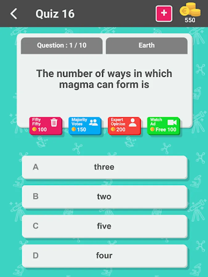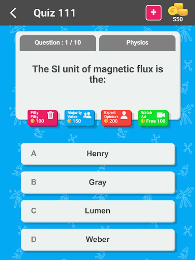 Each Quiz is composed of 10 unique questions, in order to unlock next quiz you must answer all questions correctly. Receive coins after completing quizzes or get them by watching rewarded videos and use them to get hints. Available hints are: