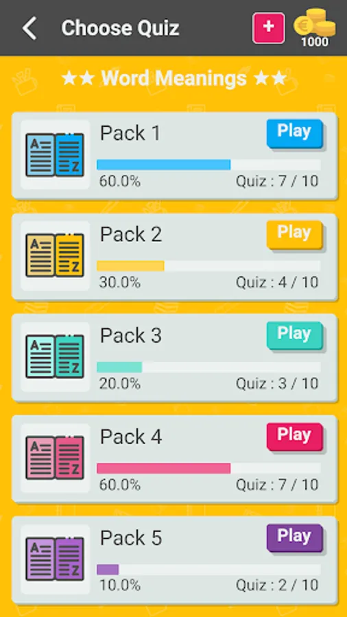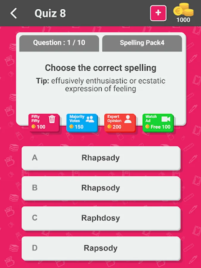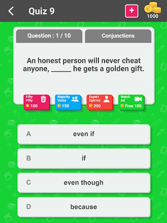 Each Quiz is composed of 10 unique questions, in order to unlock next quiz you must answer all questions correctly. Receive coins after completing quizzes or get them by watching rewarded videos and use them in getting hints. Available hints are:
