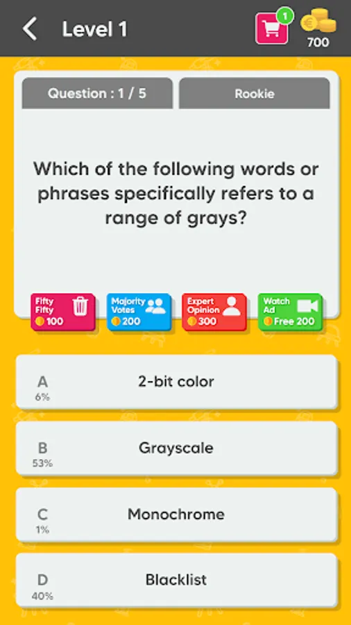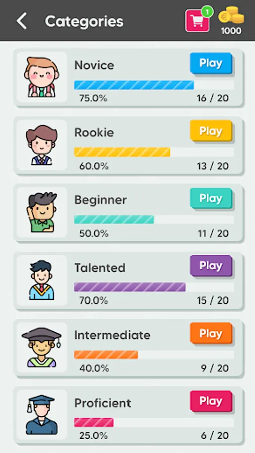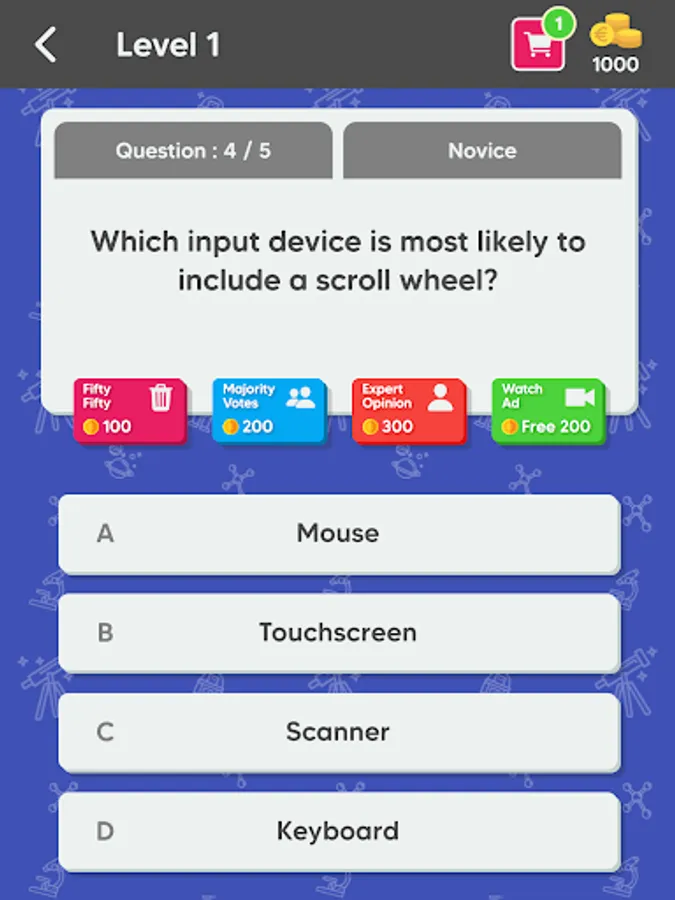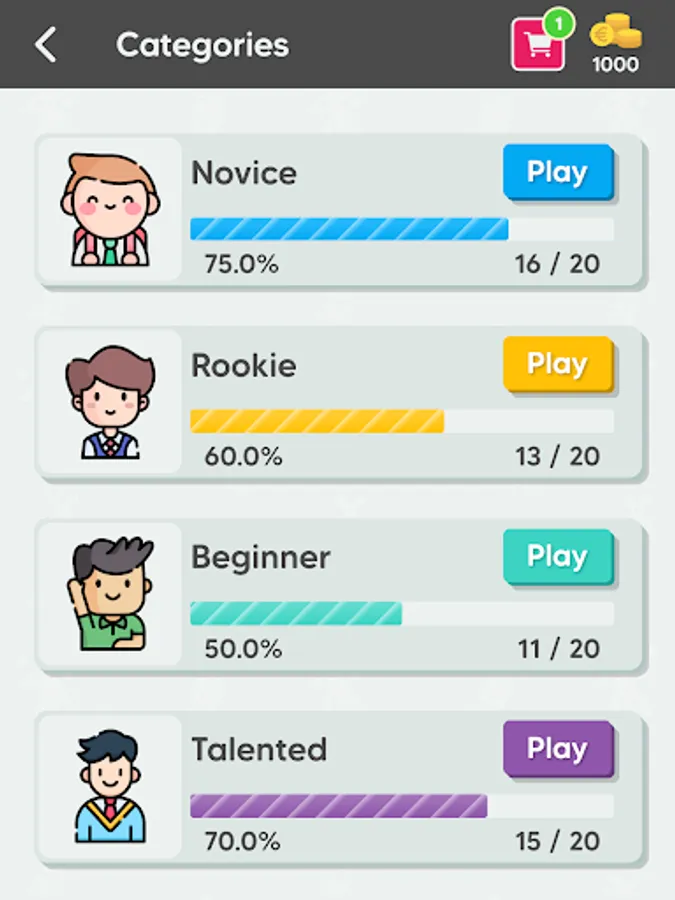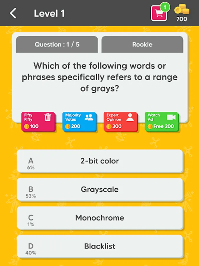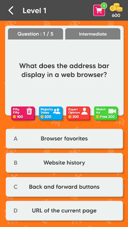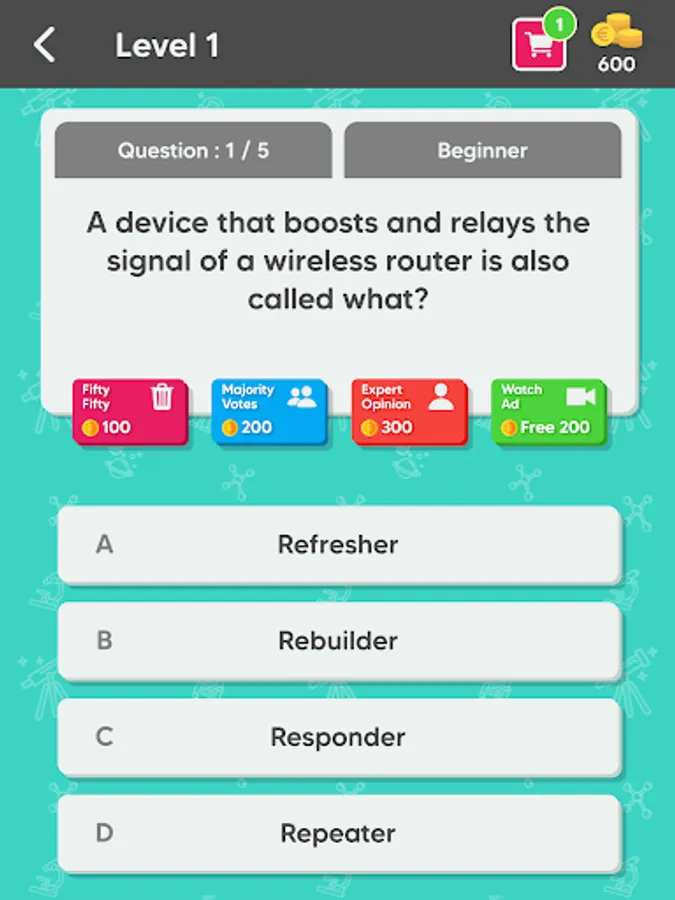Each Quiz is composed of 5 to 10 unique questions, in order to unlock next quiz you must answer all the questions correctly. Receive coins after completing quizzes or get them by watching rewarded videos and use them to get hints. Available hints are: