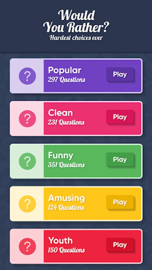Would you rather - hardest choices ever contains categorized would you rather questions. The categories included are: