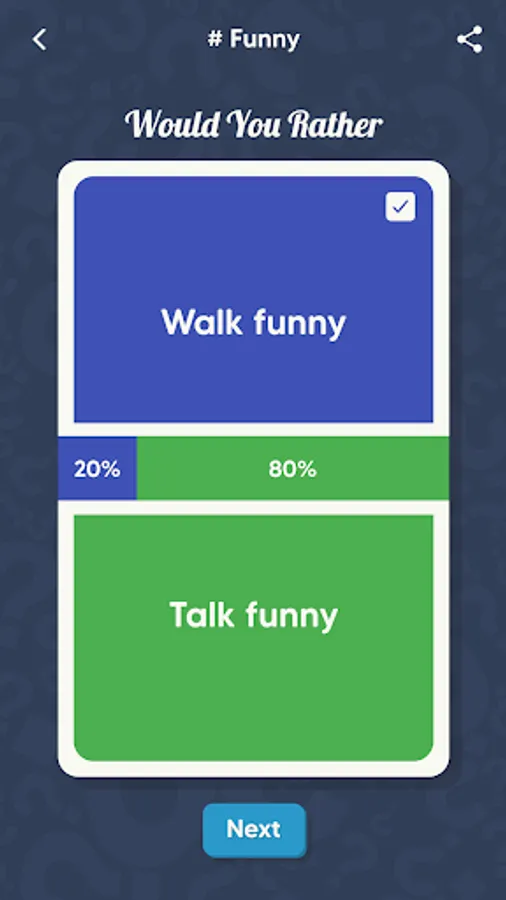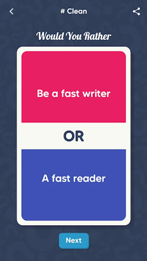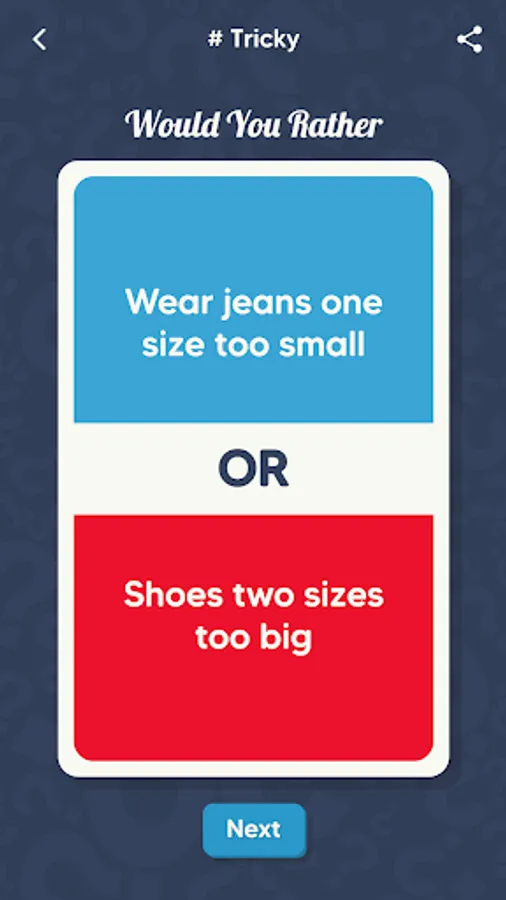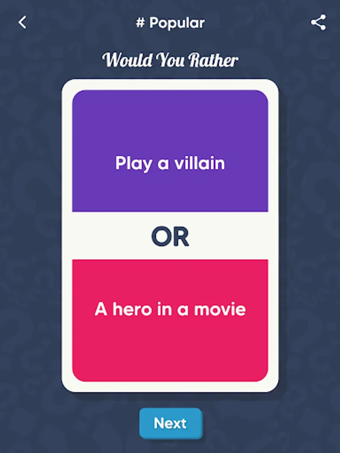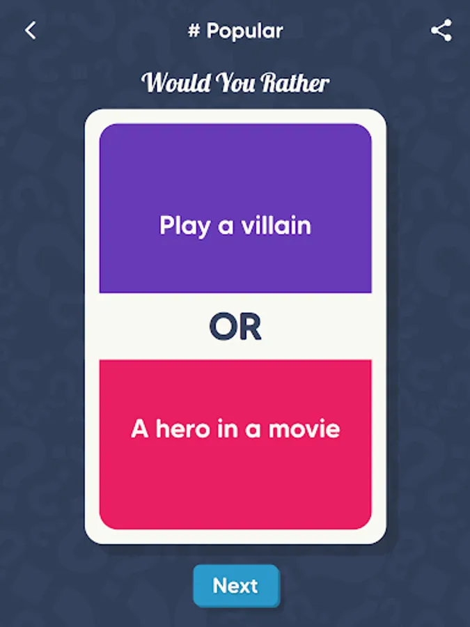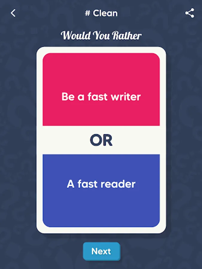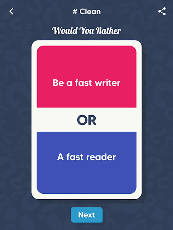 This is a funny and interesting party game that you can play at a party or at your leisure with your friends, classmates or alone. This game contains over 3500, carefully chosen, exciting would you rather questions. All these questions are categorized.