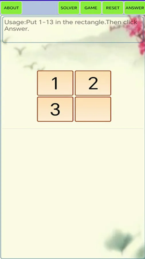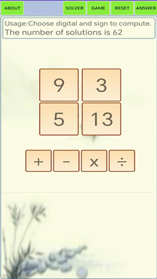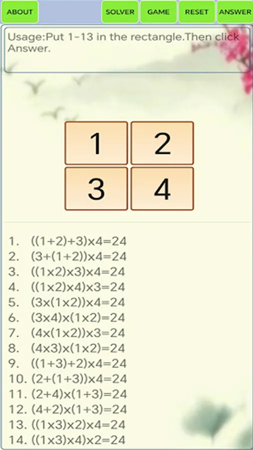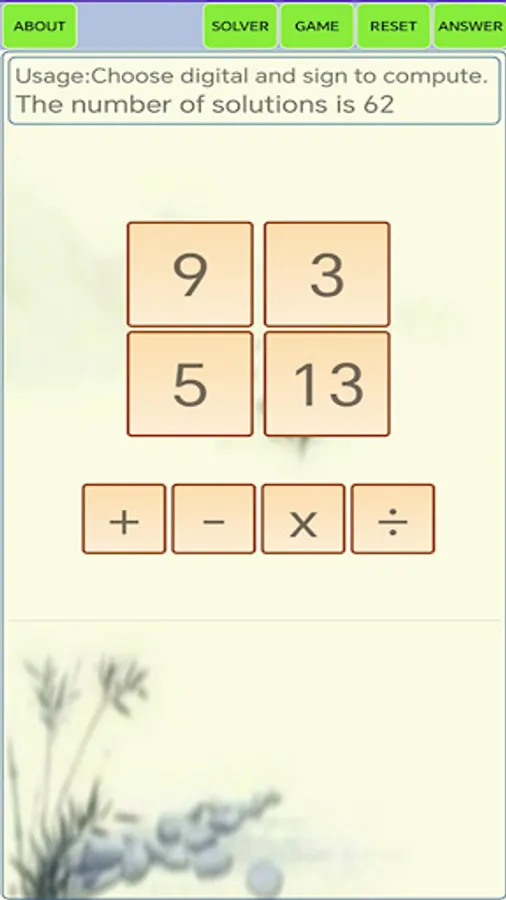This is a Math24 solver and game. In "solver" mode, put 1-13 in the rectangle, then click "answer", it presents all the solutions. In "game" mode, choose digitals and sign to computer..