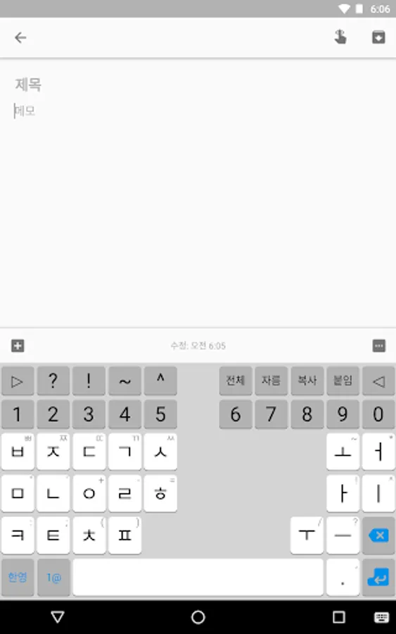 Because of the short vowel method, there are consonant collisions (eg school-> hassel). For example, if you want to hit hak, you can type ha, then quickly press a twice to enter double memory and enter ㅛ. If you can't make double consonants quickly by double consonants, press and hold to enter double consonants. This avoids consonant collisions.