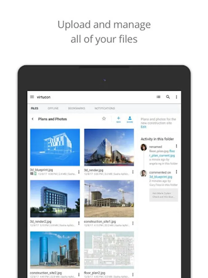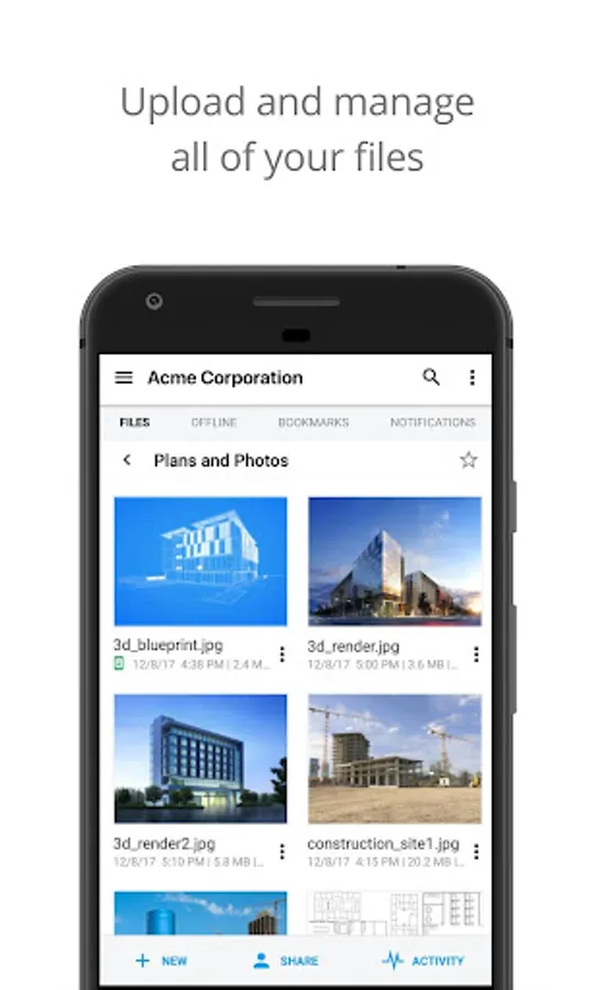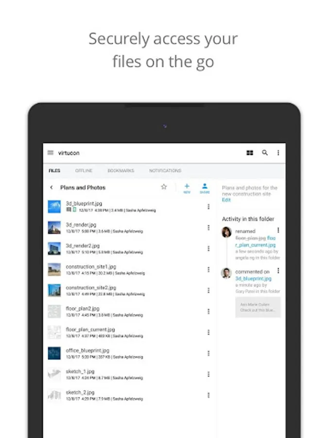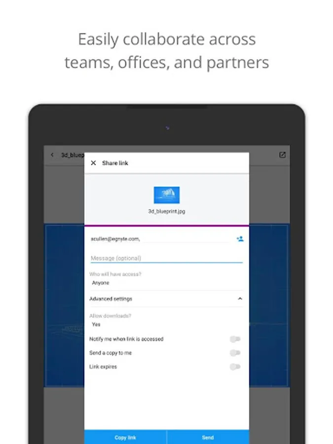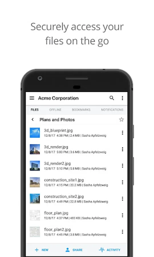 Easily set up permissions for authorized access, create link expirations, and receive notifications if/when files are accessed. Keep files secure on your mobile device with data encryption, application-specific passcodes, and remote wipe capabilities for lost/stolen devices.