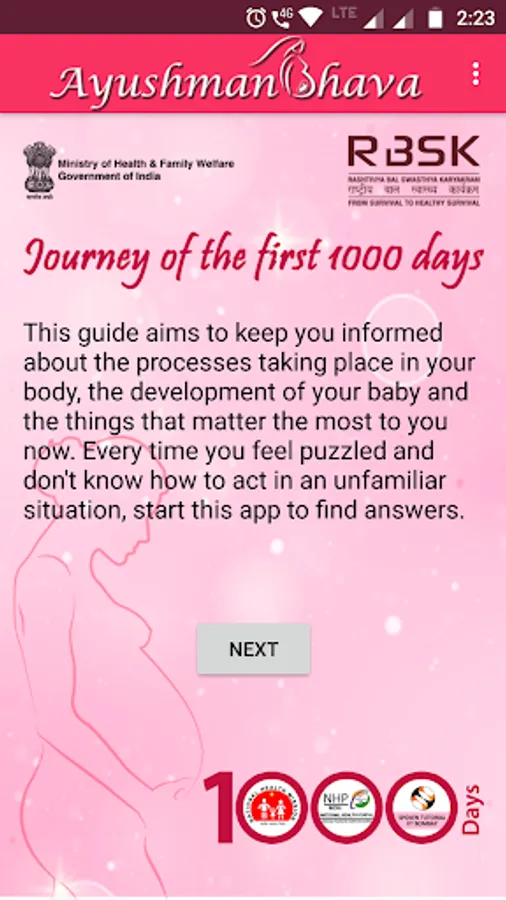 - This mobile app “Journey of First 1000 Days (Ayushman Bhava)”, is a roadmap in that direction of creating a shared valueof children’s development, across various sectors. Through this mobile app “Journey of First 1000 Days (Ayushman Bhava)”, parents and families would have a good knowledge of how best to utilize the potential of the first thousand days.