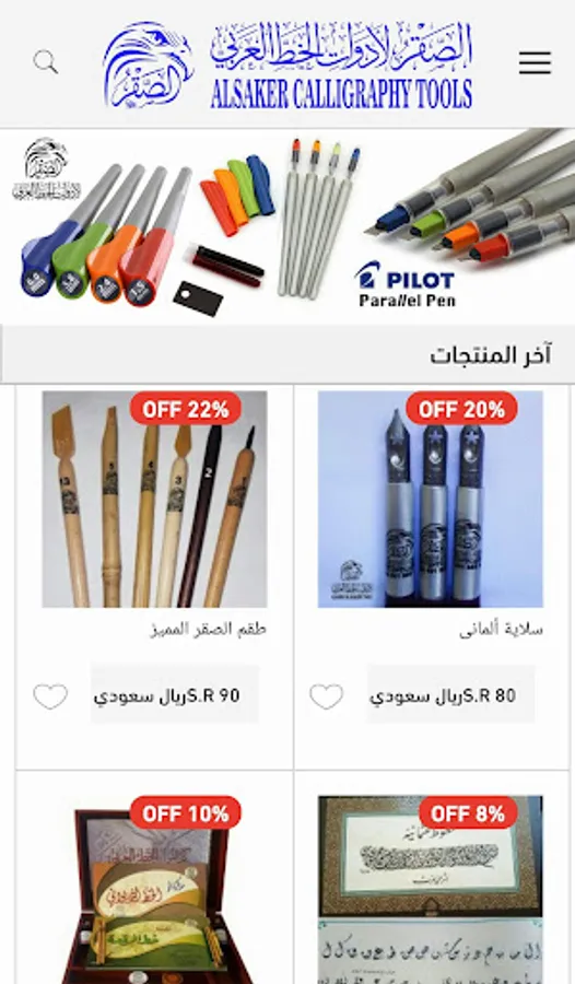 Natural paper Moqaher with hairs, Artificial paper Moqaher, Polisher to soften paper and polisher to Polish the golden paper and golden colors, Artificial Epro paper, Arabic inks, Schmincke inks with all colors, Alsaker ink red & black, Irani ink with all colors, golden inks and Silver inks with all Colors of decoration, Arabic calligraphy pens,Tommar wooden pens and, aluminum pens and all metal pens and java pens (Indonesian) and bamboo pens.