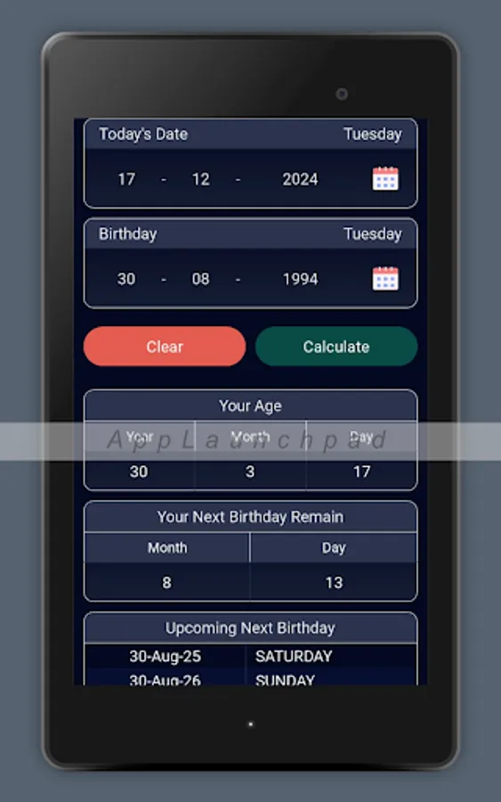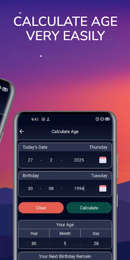 Age Calculator Pro is a user-friendly app to calculate age accurately in years, months, and days. Whether it's for birthdays, anniversaries, or other events, our app ensures precision with a clean, easy to use interface.