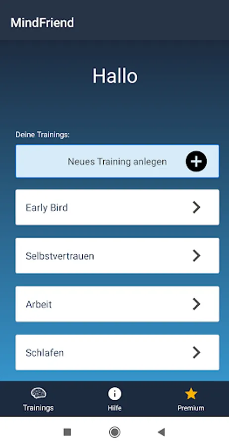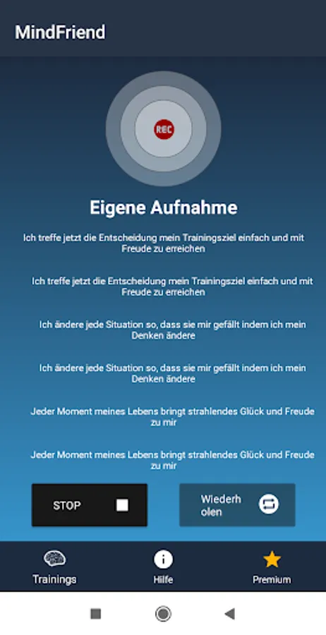Put on your list of personal training sets, set your desired goals and train within 45 seconds per training session to your personal success! You can feel stronger and mentally fitter from training session to training session - as well as increase your well-being and confidence at the same time! Through your personal success statistics, you have the opportunity to easily control your progress. MindFriend reminds and motivates you. Without entrusting yourself to another person, you can train in conjunction with prescribed audio texts (headphones) and with the eye movements (display) as well as the recurring confrontation. Hereby, mental weak spots can be desensitized and processed. The previously classified by the body as a "danger" situation can be saved as a "normal" situation step by step (from training to training). Likewise, the unpleasant feelings at the thought of it, or even in the respective situations themselves, strong decrease. If you choose the PREMIUM version (2.99 EUR / month) you can create custom training - even with your own audio texts. In addition, you can choose between a male and a female voice. The training places are unlimited.