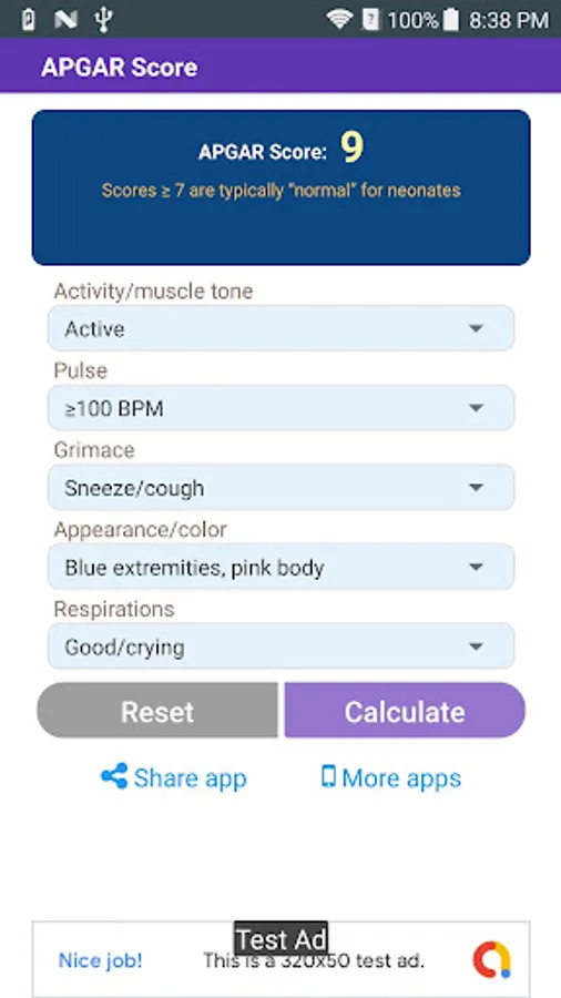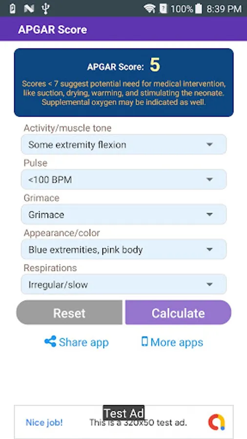 The app calculates the APGAR (Appearance, Pulse, Grimace, Activity, and Respiration) score for newborns.
