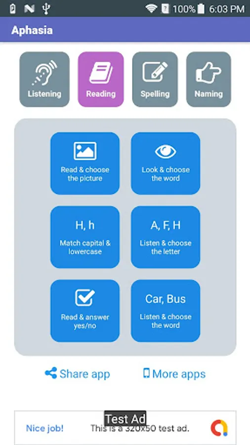 This app contains multiple exercises for aphasia therapy, which include areas of reading, listening, spelling, and naming.