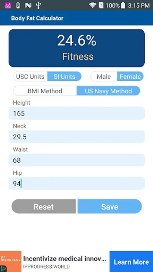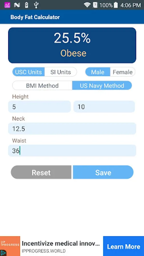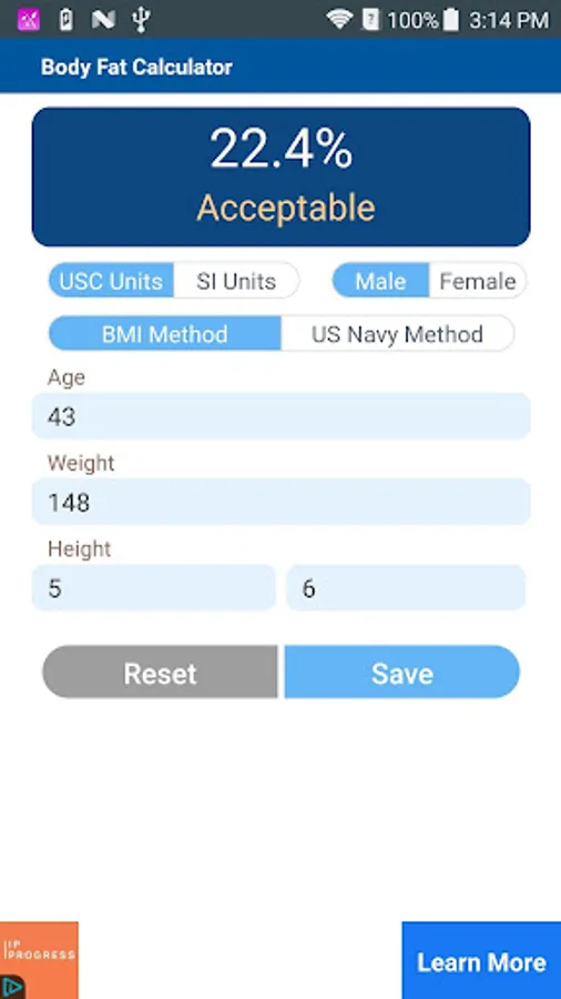 An easy to use body fat percent calculator with result interpretation. You can choose the simpler BMI calculation method, or the more elaborate US Navy method. You can also choose to save your results and view your saved results graphically in a chart.