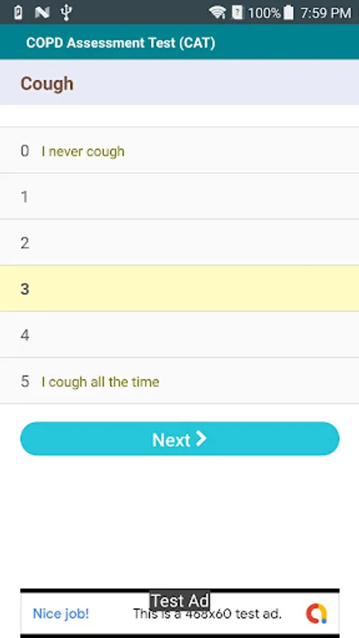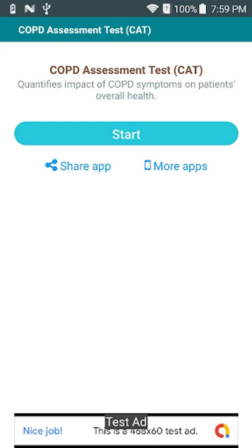 This app calculates the COPD Assessment Test (CAT) score, which is based on 8 assessment questions. The CAT score quantifies the impact of COPD symptoms on patients' overall health.
