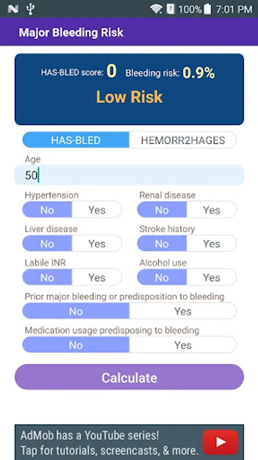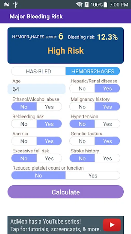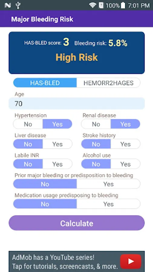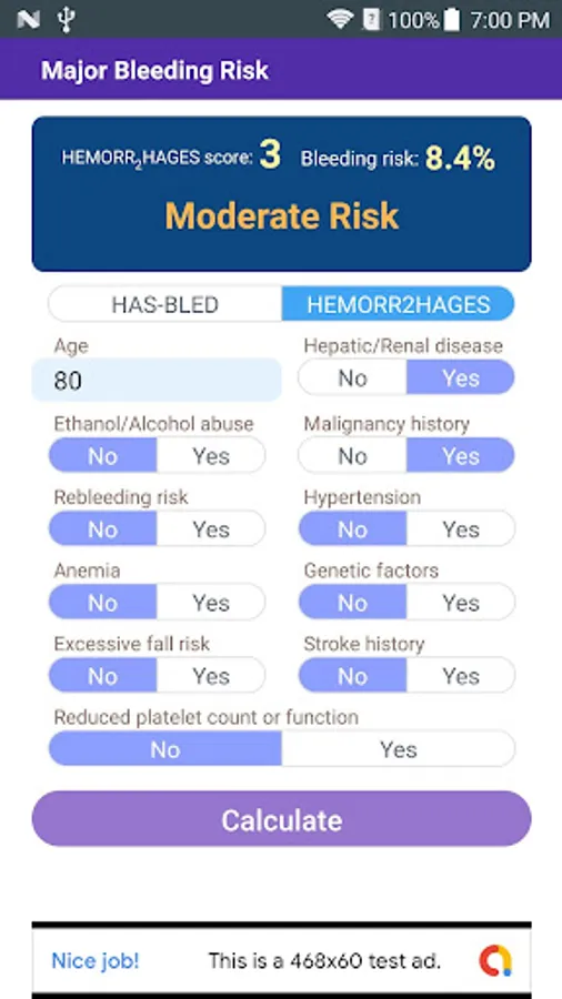 The app implements both the HAS-BLED score method and the HEMRR2HAGES score method for assessing major bleeding risk