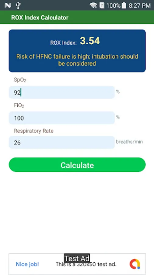 This app will calculate the ROX index based on SpO2, FiO2, and respiratory rate. After HFNC during reassessment, the ROX Index can help suggest which patients will fail HFNC and need to progress to intubation for further ventilatory support.