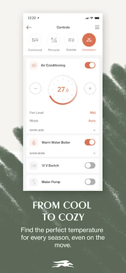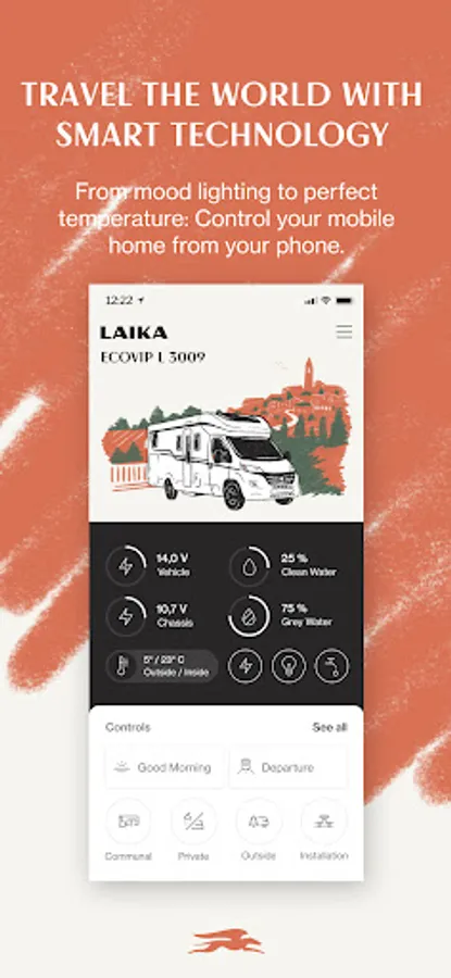 One app for a thousand destinations. The MyLaika app turns your Laika into a smart motorhome. Control your vehicle’s temperature, lighting, and more from your phone while on the go. The app makes it easy to set and adjust your personal preferences, and also keeps track of mileage, electricity, and water levels.