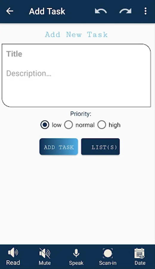 Add Tasks(with Title and Description by typing or speaking). Listen your task with voice.