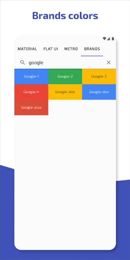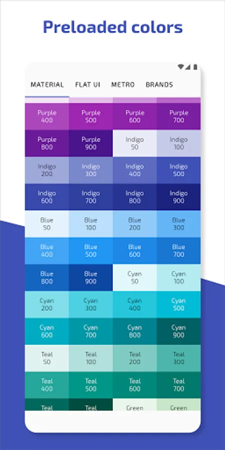 • Preloaded colors: A large list of Material colors, Flat UI, Metro, and brand colors.