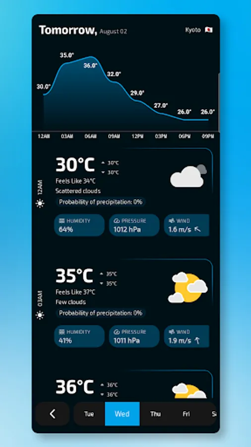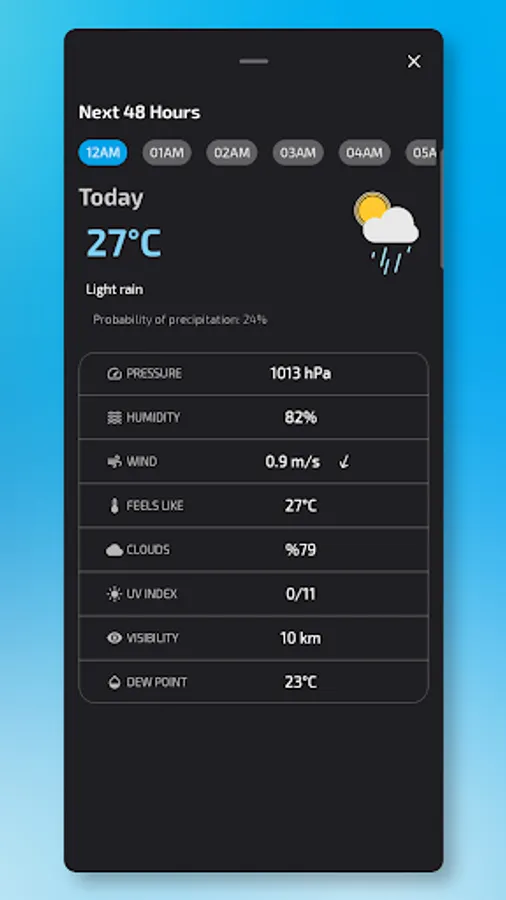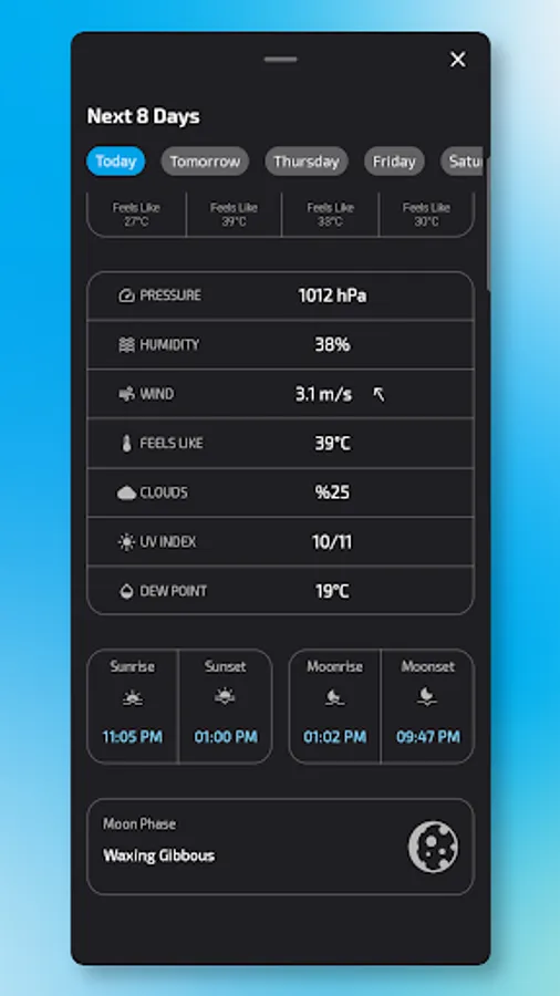 Protect yourself from harmful UV rays by checking the UV index provided daily. Additionally, the app offers key insights such as visibility, humidity, wind speed (with wind direction), pressure, and cloud cover – all crucial elements for planning your outdoor activities.