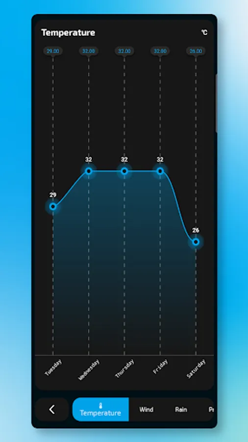 Visualize weather trends with interactive charts that display temperature, wind speed, rain, pressure, and humidity over the next 5 days. Gain a deeper understanding of how weather patterns evolve and stay ahead of any fluctuations.