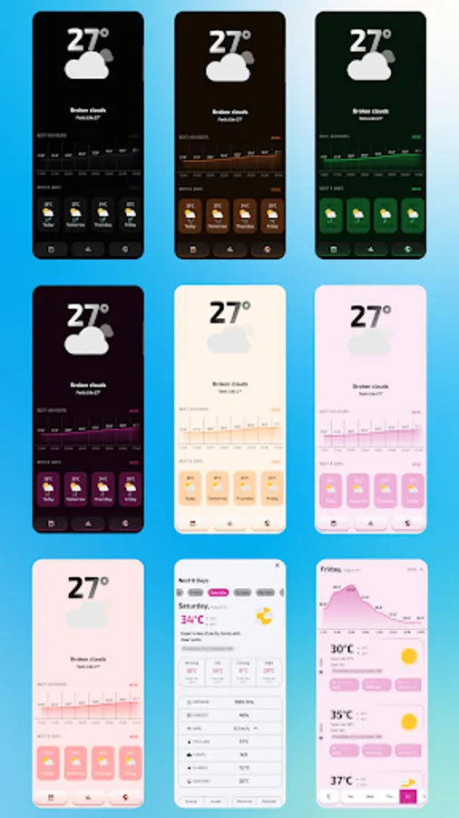 Personalize your weather experience with our sleek and user-friendly interface. Choose between two distinctive home screen modes and select your preferred theme – light or dark. Express yourself by customizing the app color and adjusting the corner to match your style.