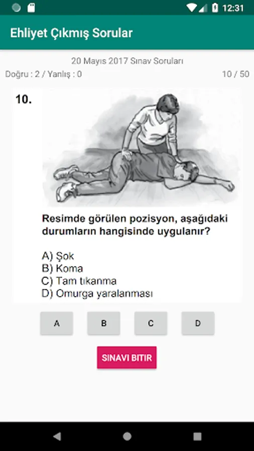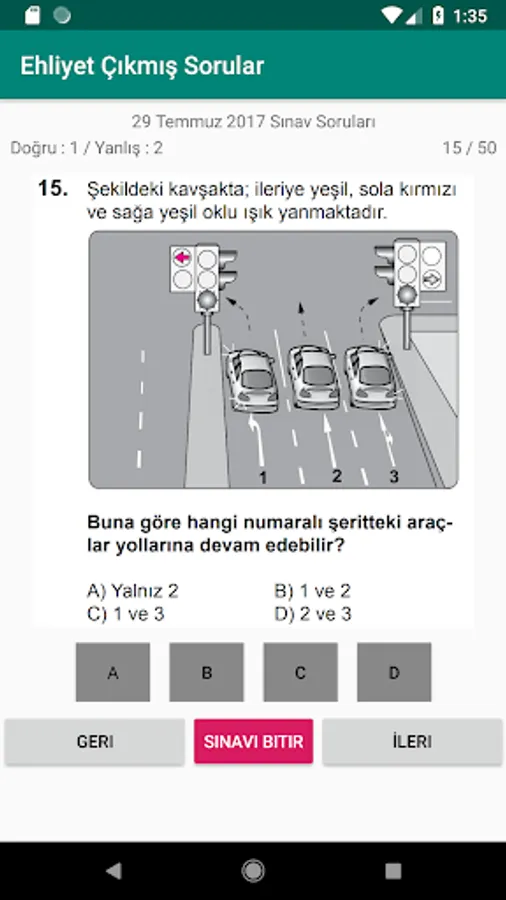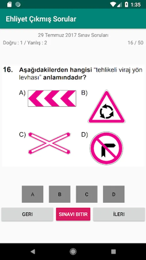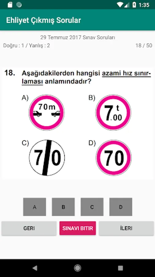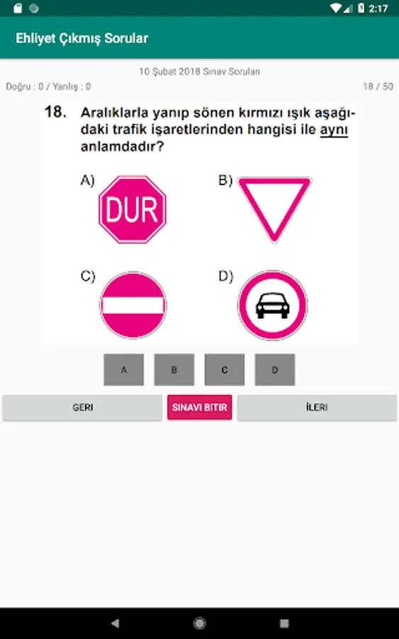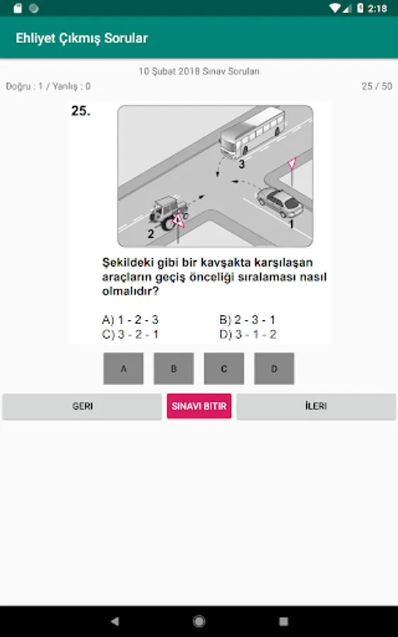 You can solve the questions about the driver's license exams and get exam experience. You can see the correct answers to the questions you have solved by going back and forth. With the Finish button, you can see your total score calculated with your correct and incorrect errors.