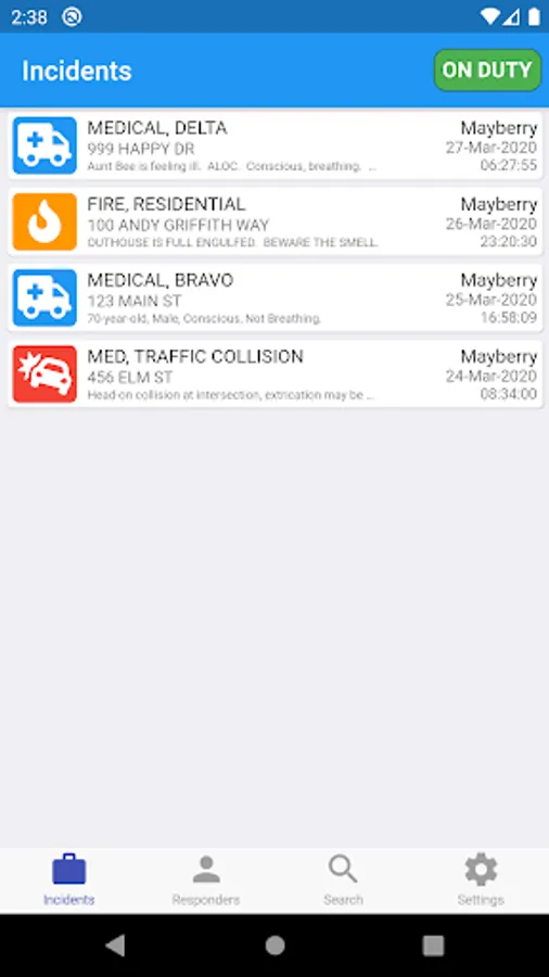 The target audience for Incident Responder are first responders who are part of a municipal agency such as a volunteer fire department or ambulance. It requires that the agency is already set up with a CAD (computer-aided dispatch) system. In order to use the app, the agency needs to have their CAD pages forwarded to an email address assigned for use by Incident Responder. Contact the developer to set this up, or to get information on how to log in with credentials for a test account in order to explore app functionality.