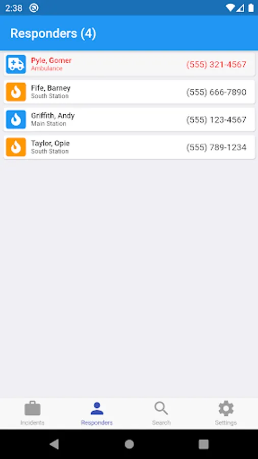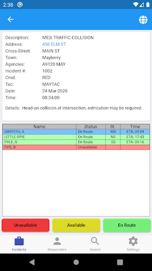 When a new incident is dispatched via CAD, it will show up nearly immediately in the app, and first responders can set their response (En Route, Available, Unavailable), along with response time and station. This allows fellow responders to quickly see who is responding to an incident and when they will be there.