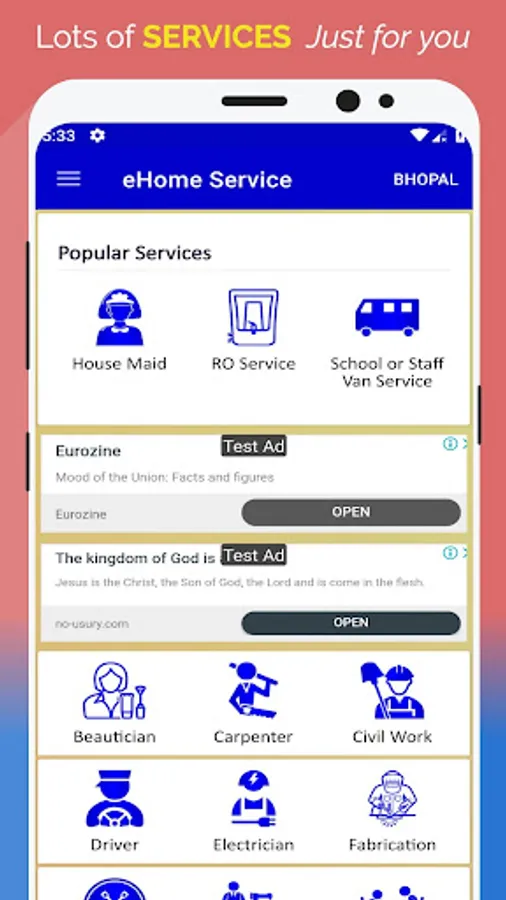 There are more than 25 Home Service Categories in this Version of e-Home Service App. In current version of the App, there are Home Services like Electrician, Plumber, Carpenter, Painter, Beautician, Home Tutor, House keeping, House Maid, Laundry Services, Photographer, Pooja(Pandit), RO service, School or Staff Van Service, Fabrication, Civil Work, Driver, Gardening, Gents Tailor, Ladies Tailor, Kabaad Wala, Labour, Personal Trainer, Pest Control, Tiffin Center, Transport, Vehicle Repair, Water Supplier, Welding etc. If a Service Provider / Service Consumer does not find Service of his/her interest, he/she may request a new Home Service through the App / Email. But the Service must be a Home Service.