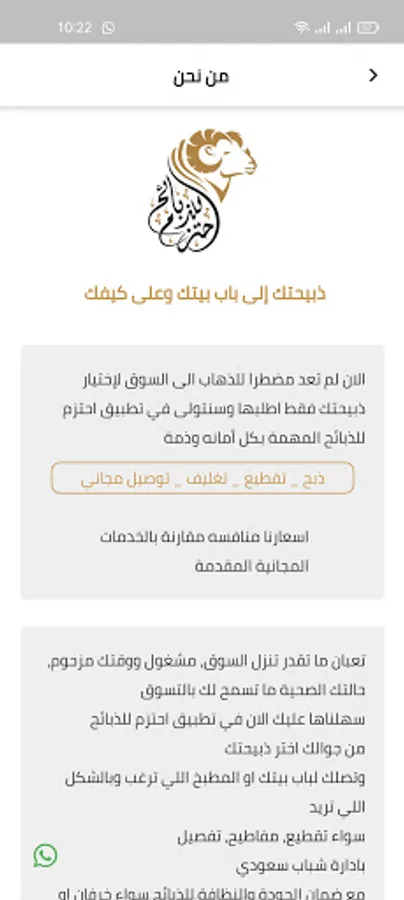 You are tired, you cannot go to the market, you are busy and your time is crowded, your health condition does not allow you to shop. We made it easy for you now in the Hazem application for sacrifices from your mobile phone. Choose your carcass and have it delivered to the door of your house or the kitchen you want and in the way you want, whether cutting, switches, detailing managed by Saudi youth with a guarantee of quality and cleanliness For sacrifices, whether sheep or goats or fillets.