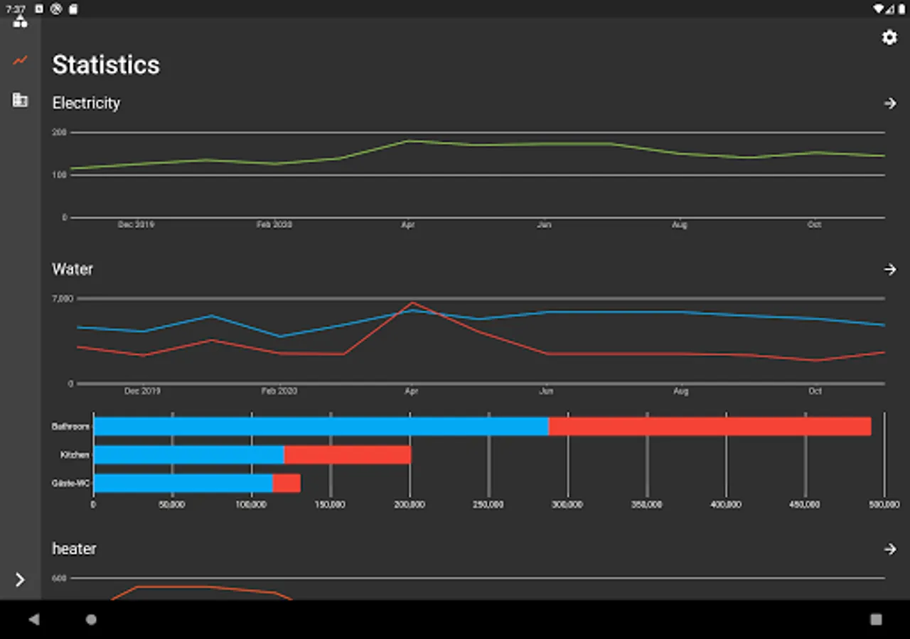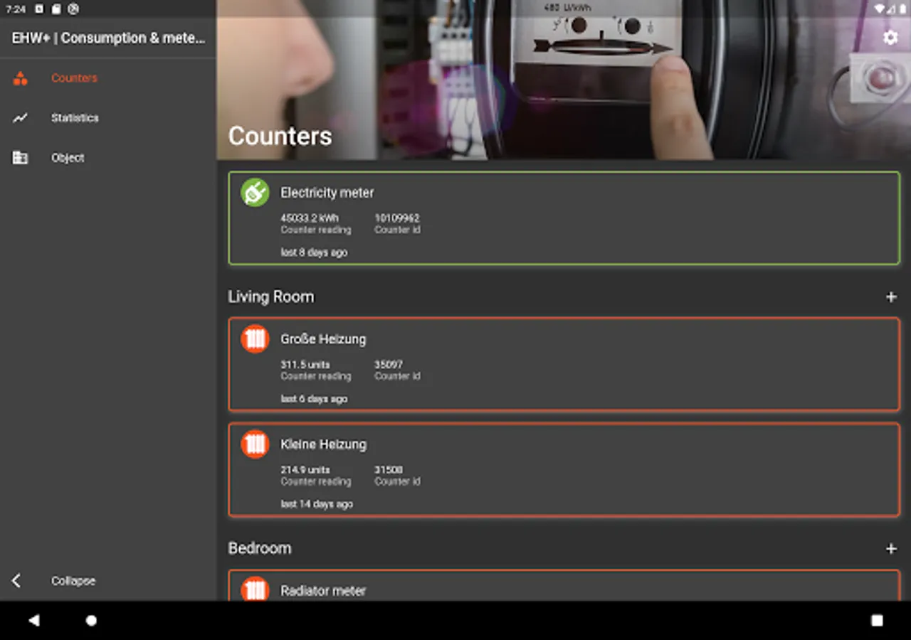 Record the meter readings of electricity meters (also HT/NT meters), water meters (hot water, cold water), radiators, oil heaters and gas meters and get an overview of consumption and its costs. Find out which room is heated the most. How much does it cost to fill a bathtub? See if electricity consumption is increasing or decreasing. This is EHW+.