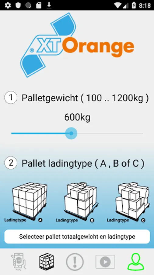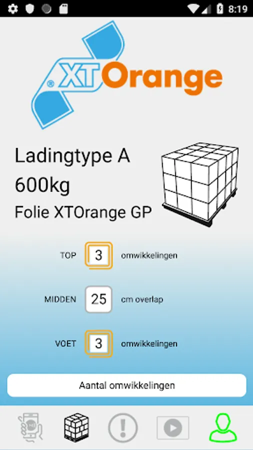 In the XT Orange® app you enter the weight and configuration of your pallet. Based on this, an advice is calculated on how to stabilize the pallet *).
