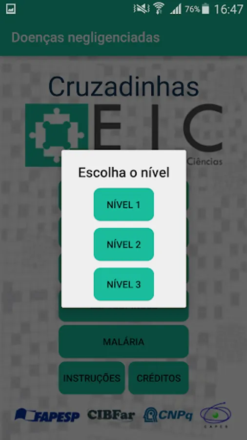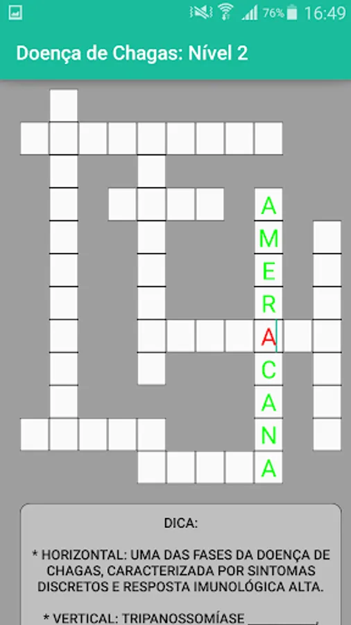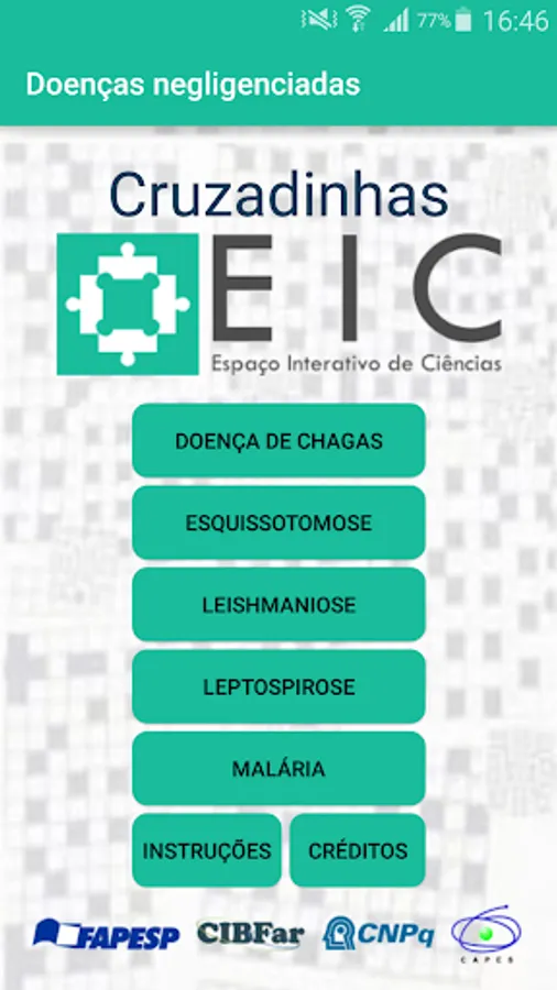 Crossword puzzle on neglected diseases: Chagas disease, schistosomiasis, leishmaniasis, malaria and leptospirosis. Each disease has 3 levels of difficulty, where the player is presented to the curiosities and important information about these diseases.