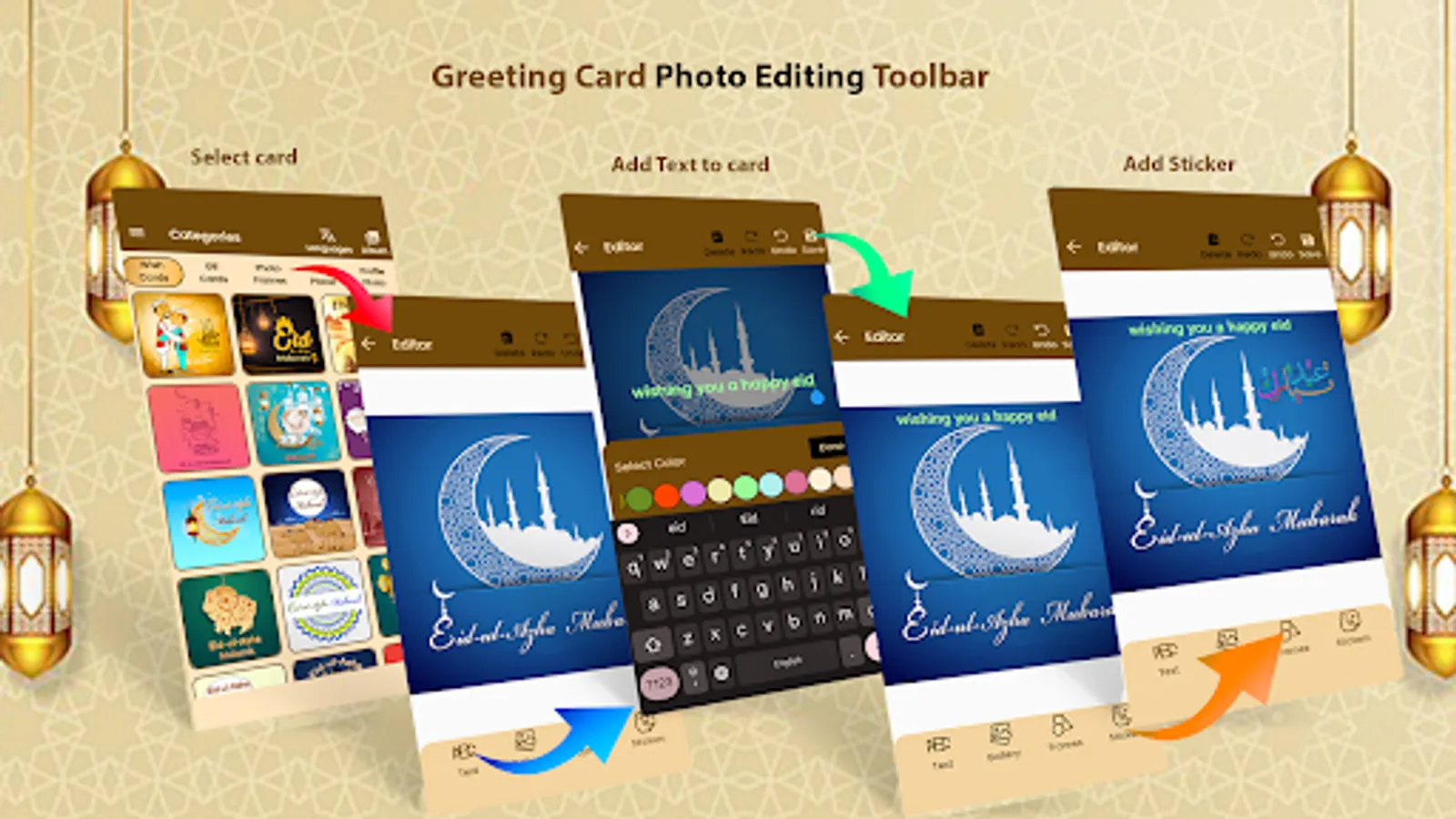 The Eid Mubarak Greetings cards app a large HD High-Quality Card Designs, Customized Eid Cards, Eid ul Adha mubarak wishes, Bakrid Greeting Card with Islamic pattern, Eid Quotes with editable card templates. You can select card according to your country traditions or you want to send someone across another country according to their country’s language, you can edit them in that format too. Like English, Urdu, Hindi, Arabic, Indonesian, French, Turkish, Bangladesh and many more. The Text editor toolbar allows you to personalize the Eid cards by adding Happy Eid Mubarak card messages & quotes in desired font type, style size, rotate and color. Moreover, you can enhance the beauty of your E-cards by adding picture frames. Eid Mubarak photo frames contain huge collection of HD Photo Frames, Traditional Eid frames, Colorful Eid Frames, Islamic special frames, Muslim Culture Frames in order to capture this holy momentous occasion. Share your creation with your family, friends and save card in Album.