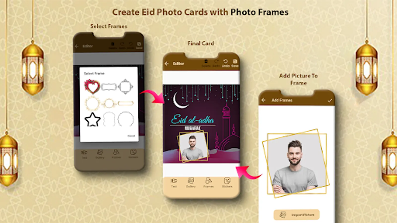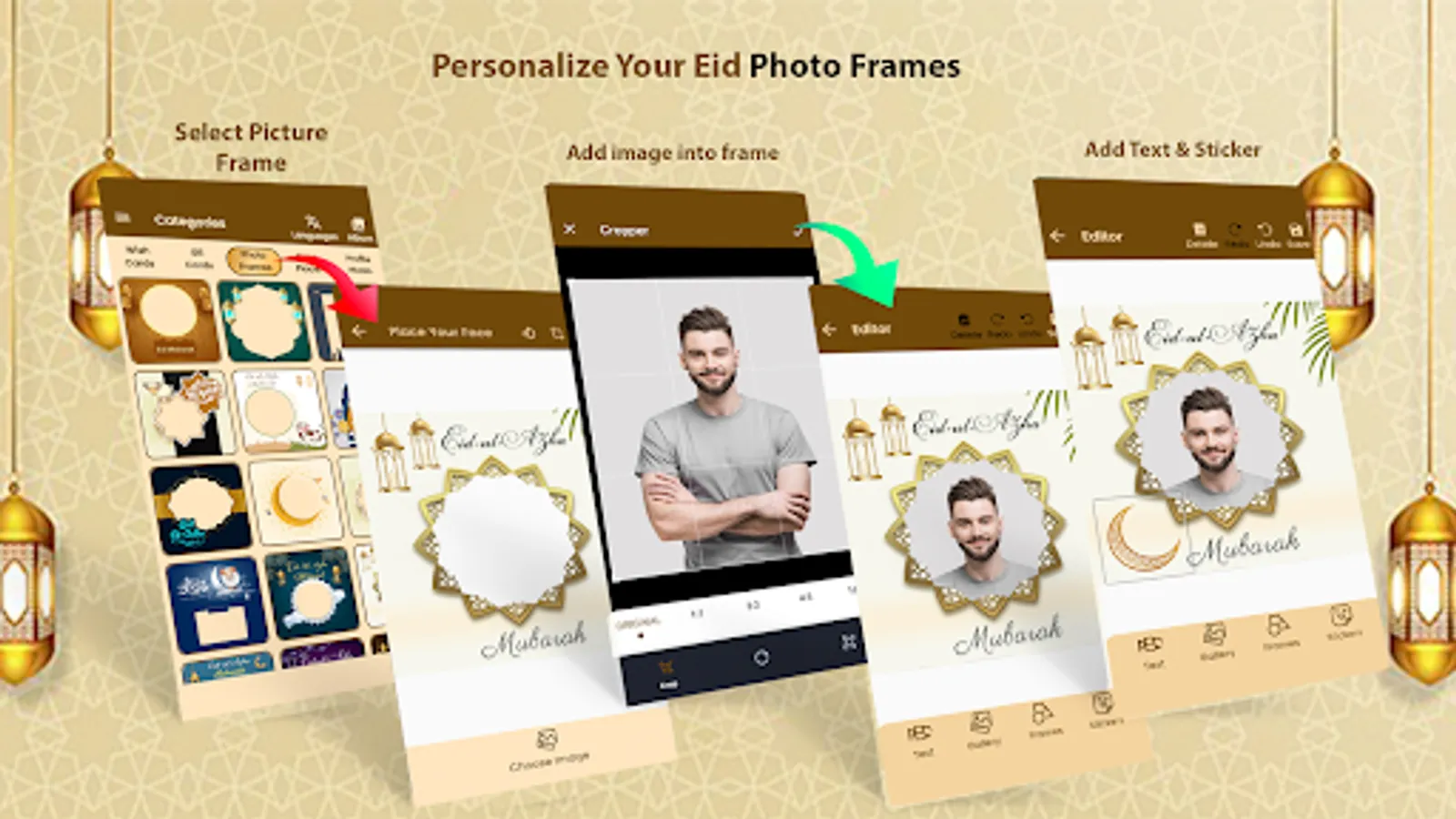 Collection of Eid photo frames with advanced photo editing tools like crop, brightness, contrast, tint & saturation.