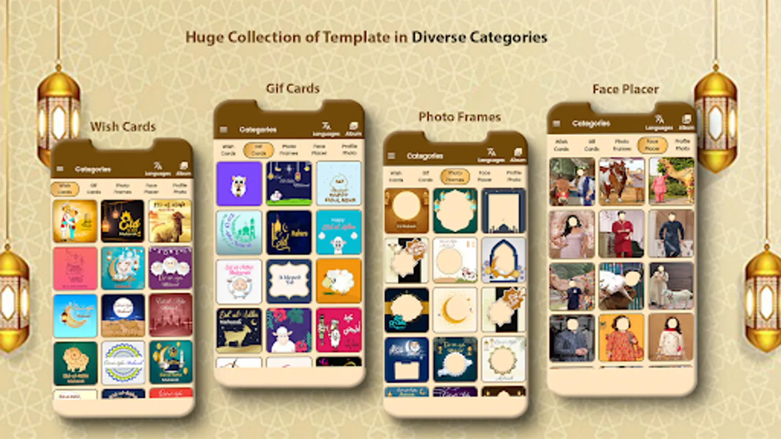 In Eid ul Azhr GIFs Card app contain huge collection of GIFs in different languages, Another important feature of online Eid card editor app to create face placer. You can import images from the gallery or click a fresh pic from camera and place your face on colorful and attractive Eid face placer which include using advanced photo editing tools. Eid stickers are available like Eid Mubarak stickers, Eid greeting Family Stickers, Happy Eid Sticker, stickers Eid Gift, Happy Muslim kids hugging, goat, cow, sheep, and buffalo, and many more. You can use all these on creation and share it on popular social media platforms such as Facebook, Twitter, Instagram, WhatsApp, Snapchat & Tiktok.