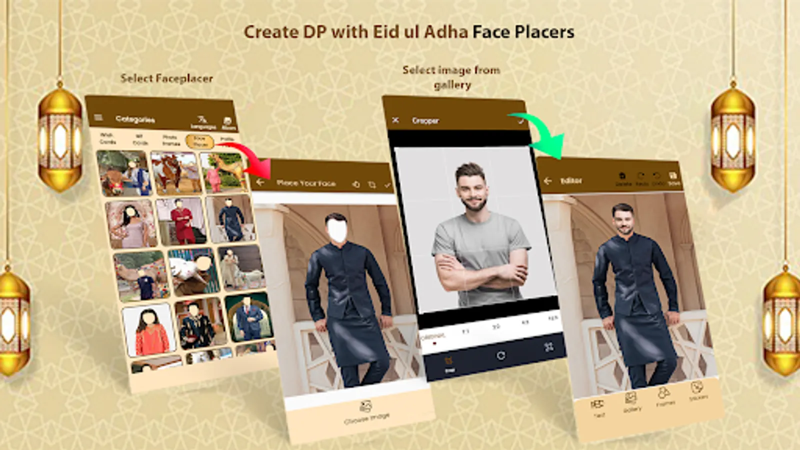 Face Placer Editor Feature to place your face photo into the chosen Eid Photo Frames.
