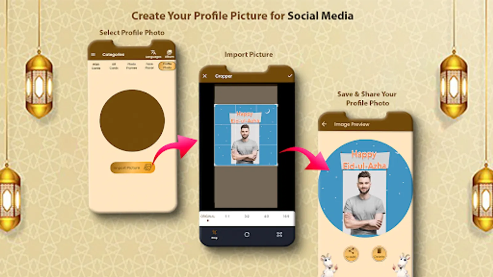 Create Profile pic, DP & thumbnails for social media platforms with Eid themes.
