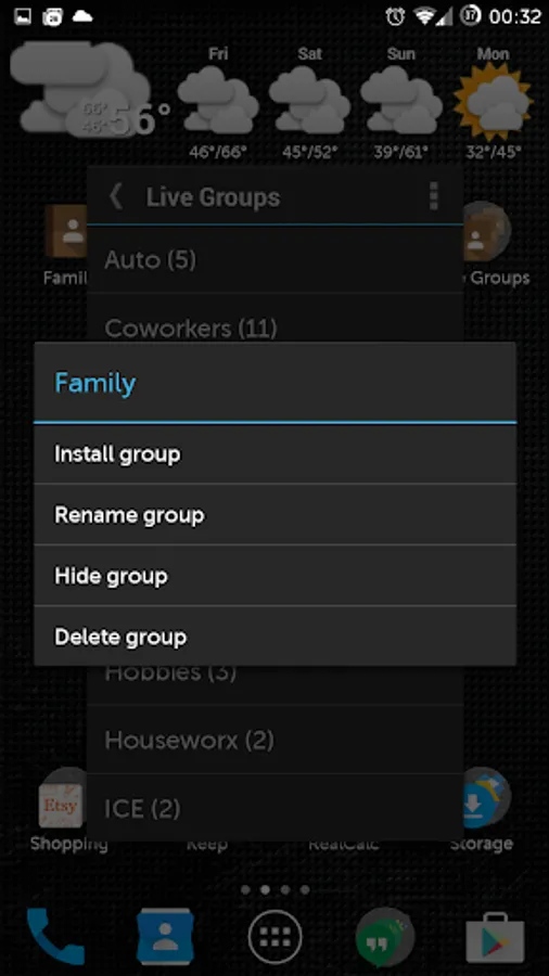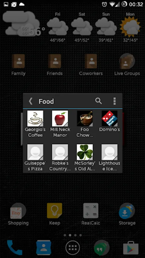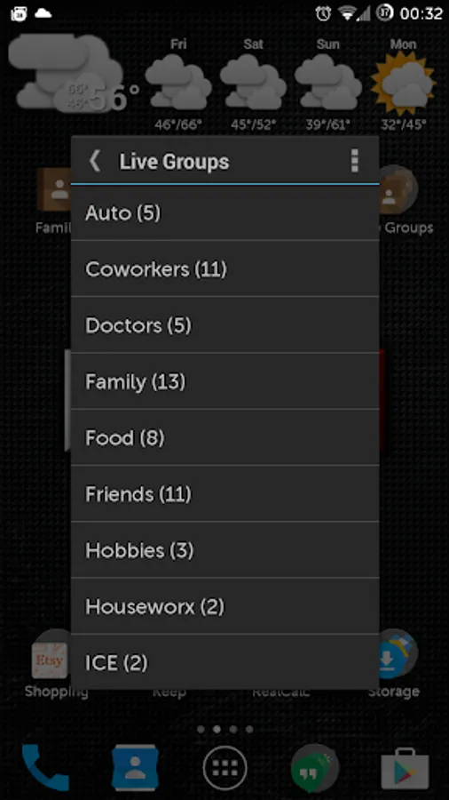This app allows you to place shortcuts on your homescreen for your contact groups (Friends, Family, Coworkers, etc.). Clicking the shortcut will launch a folder showing the contacts in the group. As you add contacts to your groups, or remove them, the folders will always show the contacts currently in the group.