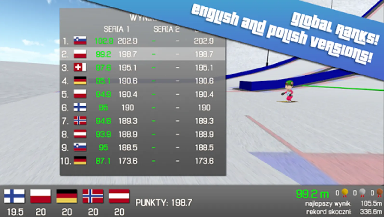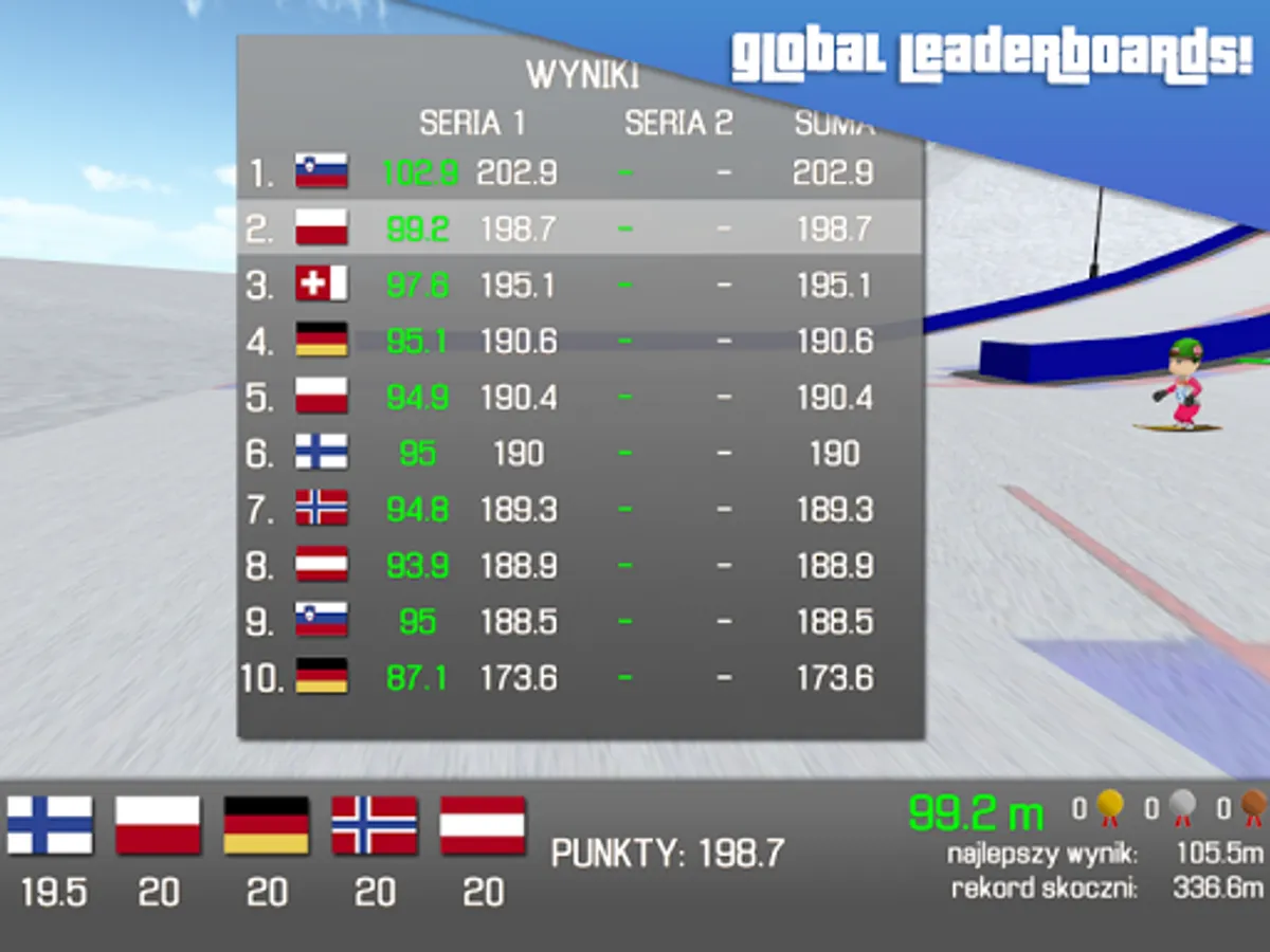 Normal hill (K-95) and large hill (K-125) are supported. Also global leaderboards are available.