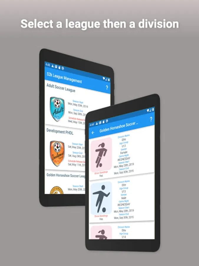 Follow the teams using the Sched2k League Management System Along with schedules for teams, standings* within their divisions are available.